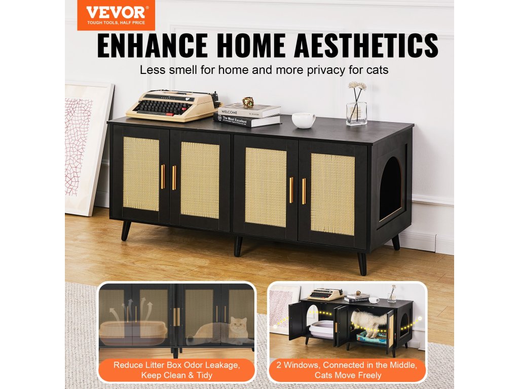A 2 ablakkal rendelkező nagy tér lehetővé teszi a macskának a szabad bejutást, és a legtöbb kutya nem tud bejutni, így a macska biztonságban és magányban lesz. Nem számít, hogy milyen méretű alomtálcát használ, ez a macskaalom-bútor tökéletesen illeszkedik, és rengeteg helyet biztosít a mozgáshoz.