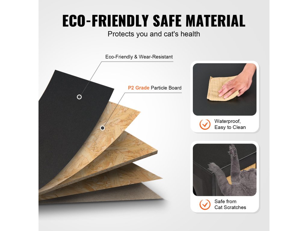 P2 minőségű forgácslapból készült, így tartós, és biztosítja az Ön és háziállatai egészségét. A kiváló minőségű kivitel vízálló, és a macskakaparás sem károsítja könnyen. Még a macskavizelet vagy más foltok is könnyen letörölhetők, így a napi karbantartás sokkal könnyebbé válik.