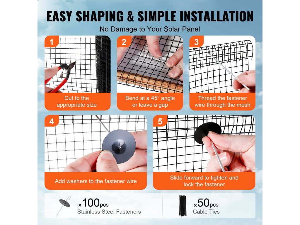 Ez a napelem-védő készlet a könnyű telepítéshez szükséges utasításokkal együtt kerül szállításra. Percek alatt, egyszerű szerelési lépésekkel, bonyolult szerszámok vagy szakmai ismeretek nélkül. Ezenkívül számos helyen használható, beleértve a veteményeskerteket és a háztetőket is.