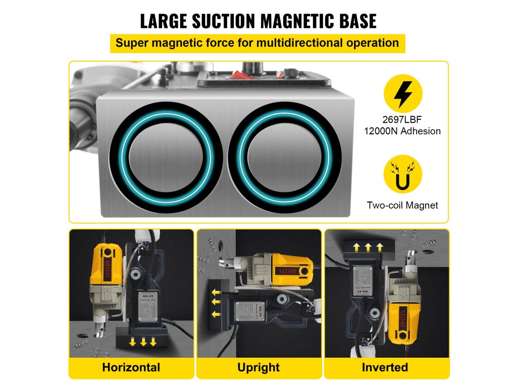 A szinte tiszta vas alap szilárdan rögzíti a varázsfúrót, mivel egy erőteljes elektromágnes 2697 font (12 000 N) erővel megakadályozza a mozgást fúrás közben.