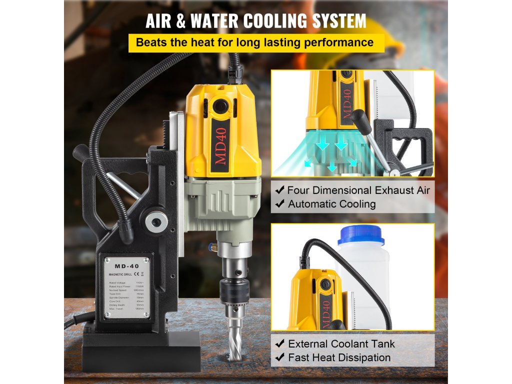 A hordozható fúrógép kivehető beépített hűtőrendszerrel van felszerelve, amely segít jelentősen megnövelni a fúrófejek és a vágók élettartamát. Mi több, porzáró légbeömlő és légkivezető nyílások a hőmérséklet csökkentése érdekében.