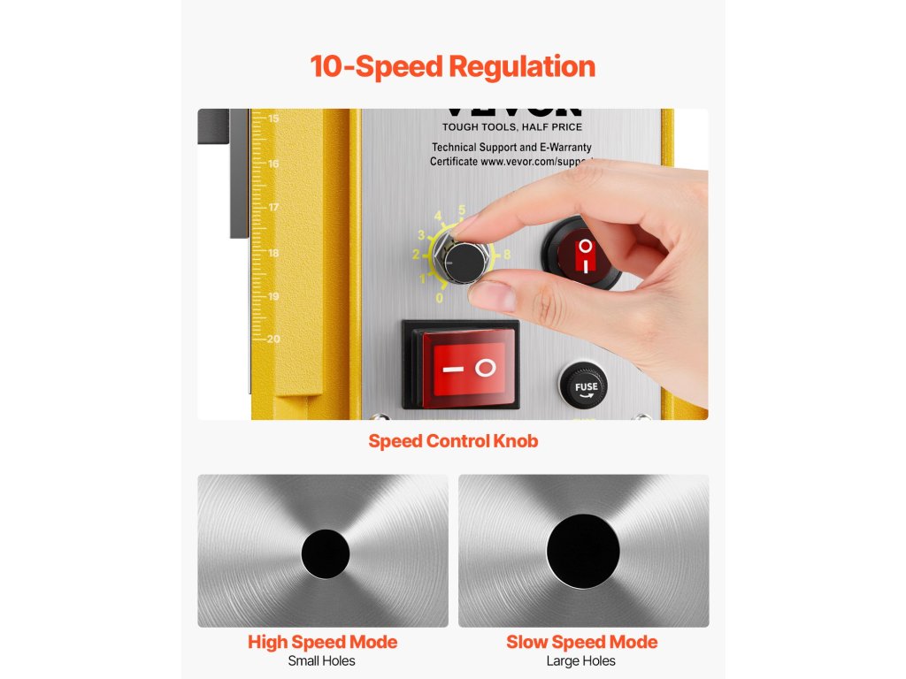 Pontos sebességbeállítás a fúrási átmérő alapján. Kisebb furatok esetén kapcsoljon magasabb fordulatszámra a hatékony fúrás és a sima furatfalak érdekében. Nagyobb lyukak esetén csökkentse a sebességet a fúrószerszám sérülésének vagy a túlzott sebesség okozta elállítódásnak a megelőzése érdekében, jelentősen javítva a fúrási pontosságot.