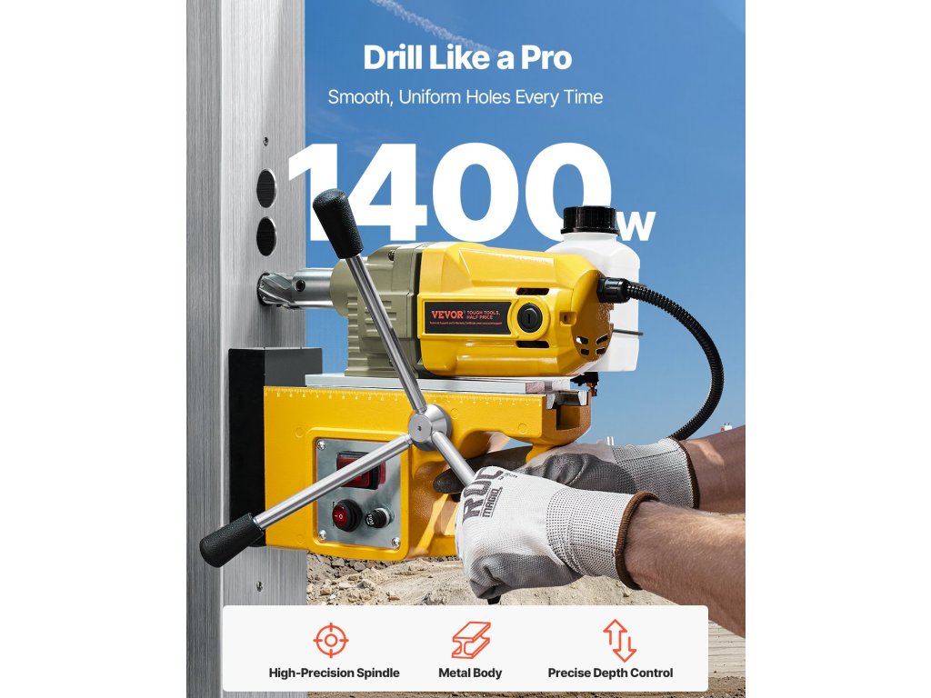 Mágneses fúrónk 1400 W-os motorral és 800 fordulat/perc sebességgel büszkélkedhet, ami jelentősen növeli a fúrás hatékonyságát, különösen a kiterjedt fúrást igénylő projekteknél. Stabilabb működést, nagyobb pontosságot és jobb felhasználói kényelmet garantál.