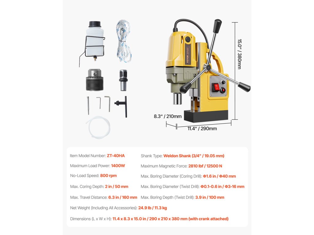 Mágneses fúró fémhez 1400 W, átmérő 1,6 hüvelyk, 2810 lbf, 800 fordulat/perc