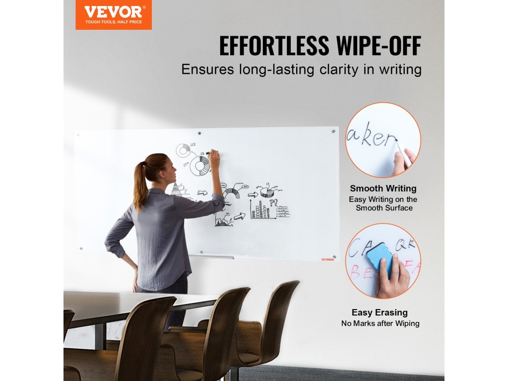 Mágneses üvegtábla 183×91 cm, falra, keret nélkül, polccal és radírral