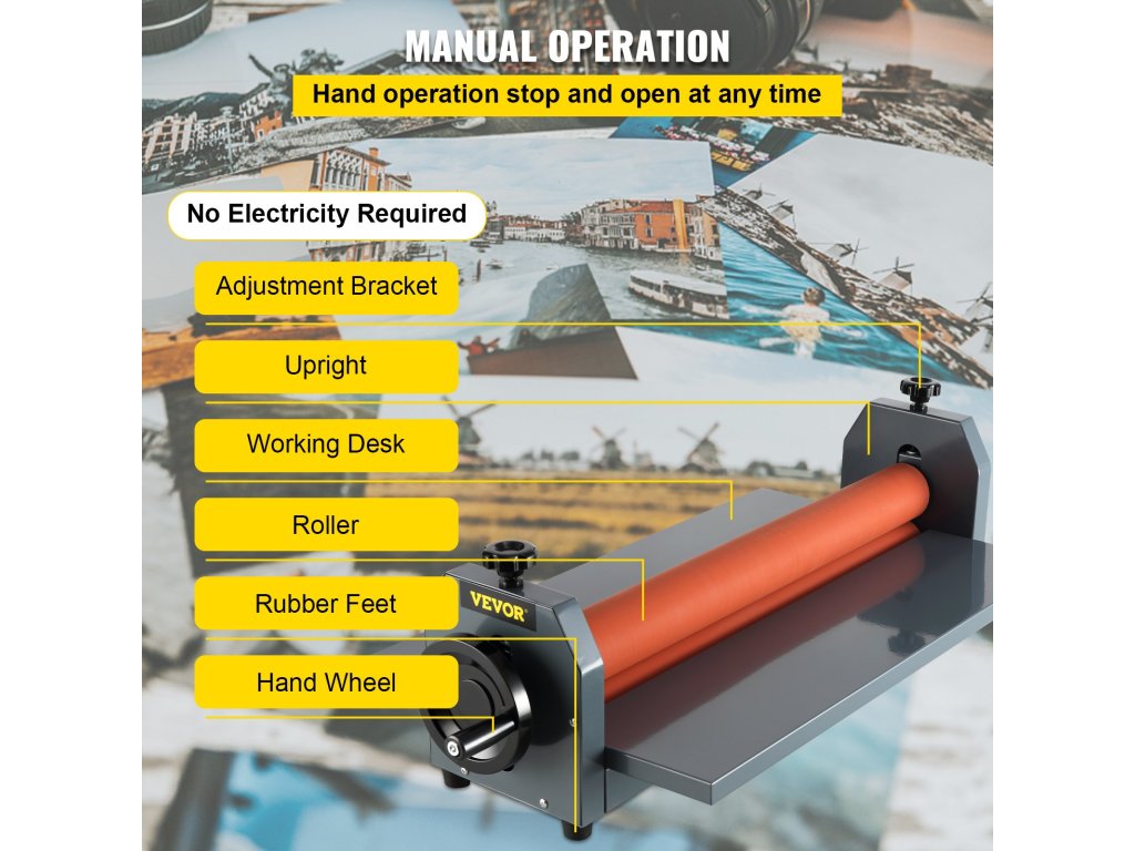 A gépet kézzel működtetik, és bármikor leállítható és kinyitható, hogy jobban megfeleljen az ügyfél igényeinek. A kézi kerék alkalmas fényképek, kártyák, bizonyítványok, munkavállalási engedélyek, étlapok, képek stb. laminálására.