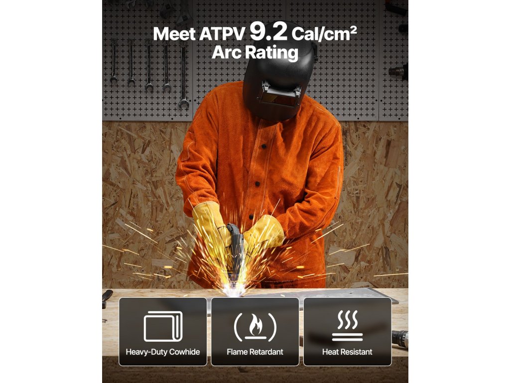 Ez a sokoldalú, lángálló bőr hegesztőkabát kivételes védelmet nyújt, mivel 9,2 Cal/cm² ATPV ívvédelmi szintet ér el, és hatékonyan ellenáll a magas hőmérsékletnek és a lángoknak.