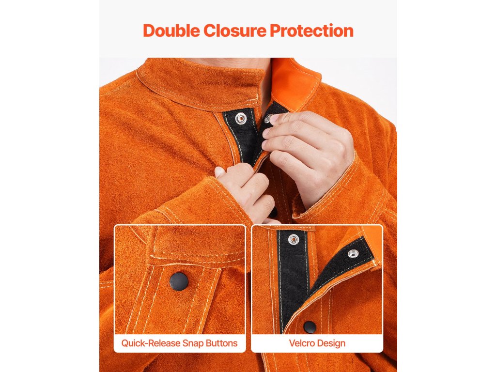 A hőálló gombos rögzítés és a nagy tapadású tépőzár gyors felvételt és biztonságos lezárást biztosít, így biztonságot és kényelmet nyújt munka közben. (A kabát első kinyitásakor erős bőrszagot érezhet; a szag eloszlatása érdekében helyezze jól szellőző helyre)