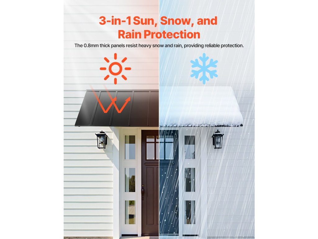 Ez a 104×36 hüvelyk méretű ajtókárpit bőséges fedezetet nyújt ajtaja, ablakai és kültéri helyiségei védelmére. Erős és tartós marad nagy szélben, esőben, hóban és intenzív napsütésben is. A lejtős kialakítás hatékony vízelvezetést biztosít, megakadályozva a víz összegyűlését.