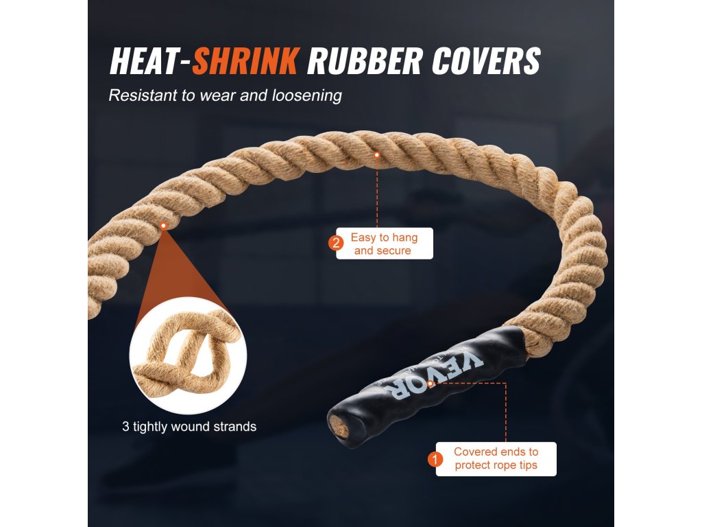 Az edzőtermi fitneszmászó kötél 3 szálból áll, szorosan feltekerve, sűrű szálszerkezettel, amelyek mindkét végén fekete, hőre zsugorodó gumiborítással vannak borítva. A fém mászóhorog kialakításnak köszönhetően a kötél könnyen rögzíthető bármilyen fix ponthoz, megkönnyítve ezzel a testmozgást és az erőnléti edzést.