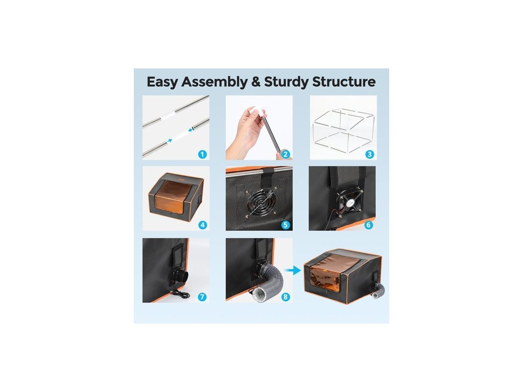 A lézergravírozó háza percek alatt felszerelhető, és nem igényel speciális szakértelmet. Könnyű és összecsukható kialakításának köszönhetően pedig könnyen tárolható és szállítható.