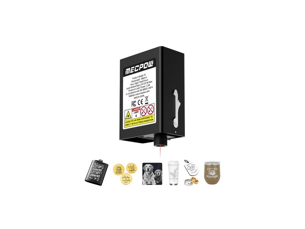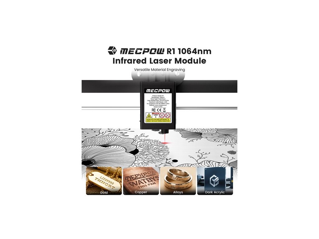 A Mecpow R1 1064 nm-es infravörös lézermodult különféle fémek, többek között arany, ezüst, platina, réz, alumínium, cink, vas, rozsdamentes acél, fémoxidok, ötvözetek, műanyagok és sötét akrilok gravírozására tervezték.