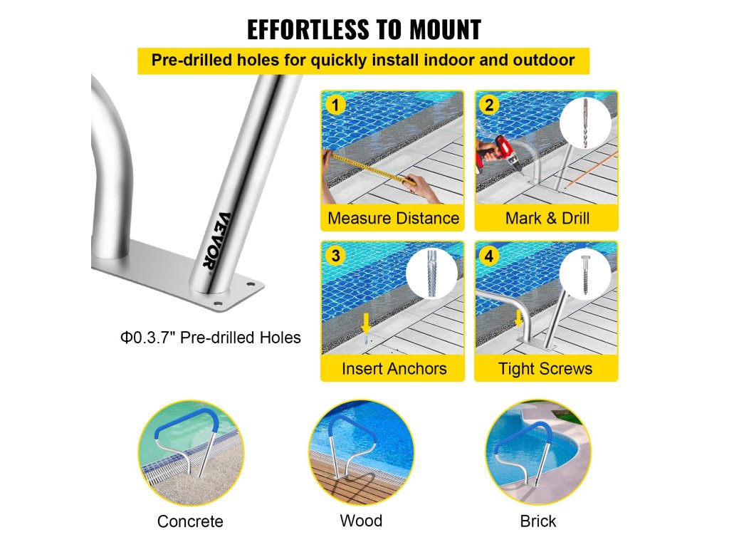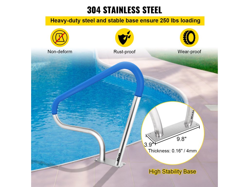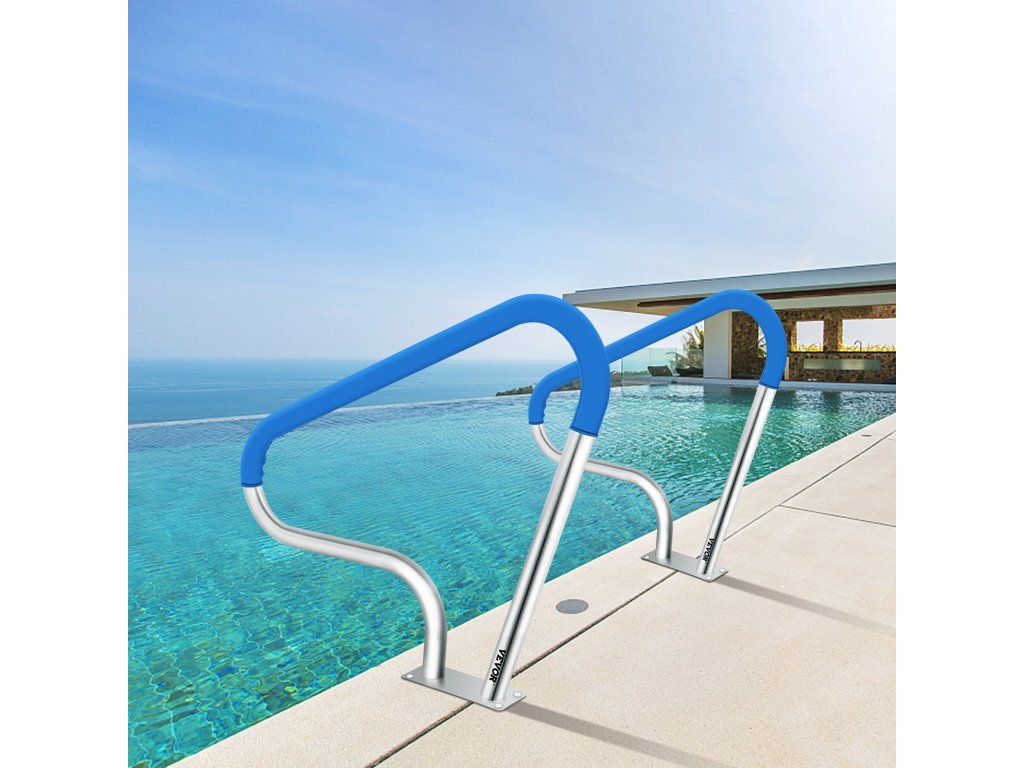 A lépcsős medence korlátot úgy tervezték, hogy segítse a medencébe való könnyű és biztonságos ki- és beszállást. A medencekorlát felhasználóbarát kialakítású, 3 ívvel rendelkezik a kényelmes fogás érdekében.