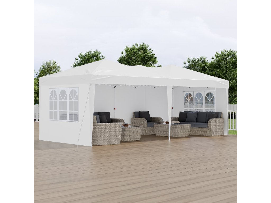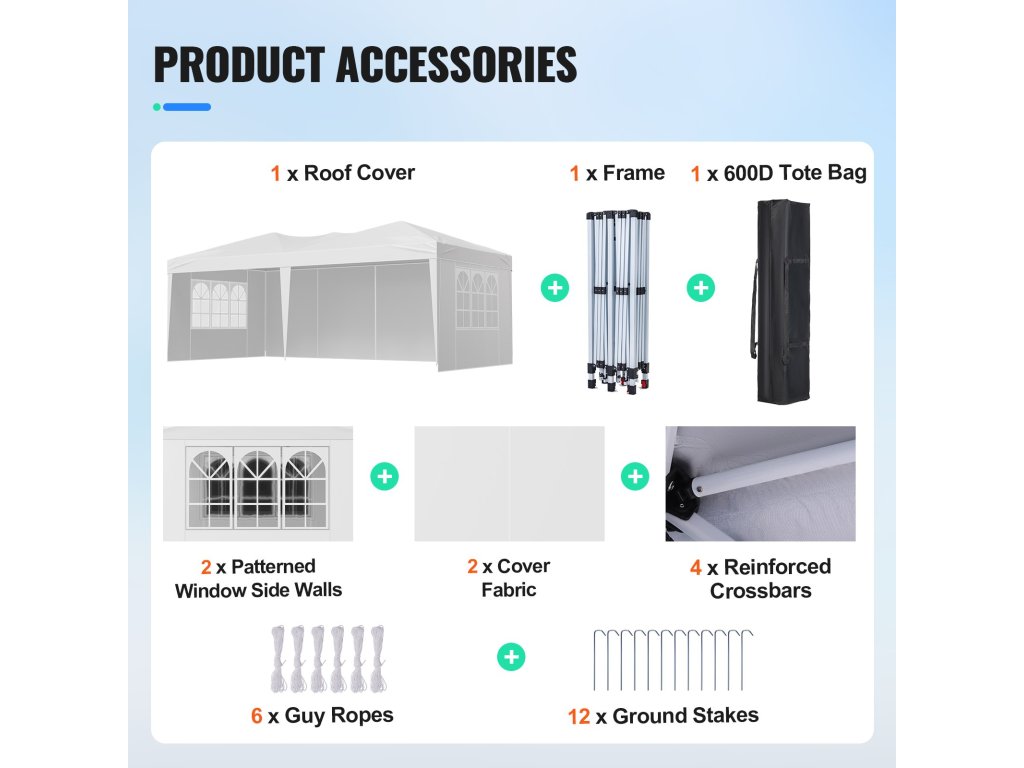 Ez a VEVOR 10 x 20 láb méretű pop-up pavilon oldalfalakkal és tágas, 200 négyzetméteres területtel tökéletes családi összejövetelekhez, grillezésekhez és egyéb szabadtéri tevékenységekhez. Egyszeri tolós kialakítása biztosítja a gyors és egyszerű összeszerelést, így több időt tölthet a szabadban való tartózkodással.