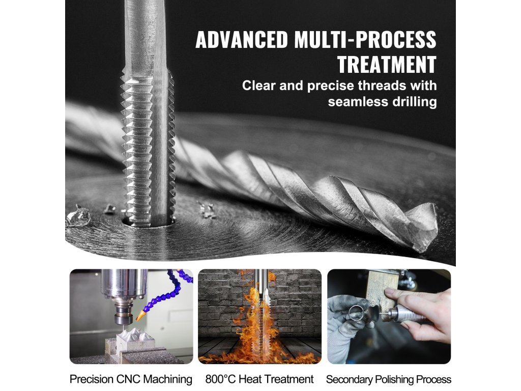 Ez a csapoló készlet kemény csapágyazott acélból készült a páratlan tartósság és teljesítmény érdekében. A precíziós CNC megmunkálással és másodlagos polírozással ezek a szerszámok kiváló pontosságot biztosítanak. A hordozható tárolótáska biztonságos tárolást biztosít. Mondjon búcsút az inkonzisztens és hiányos meneteknek.