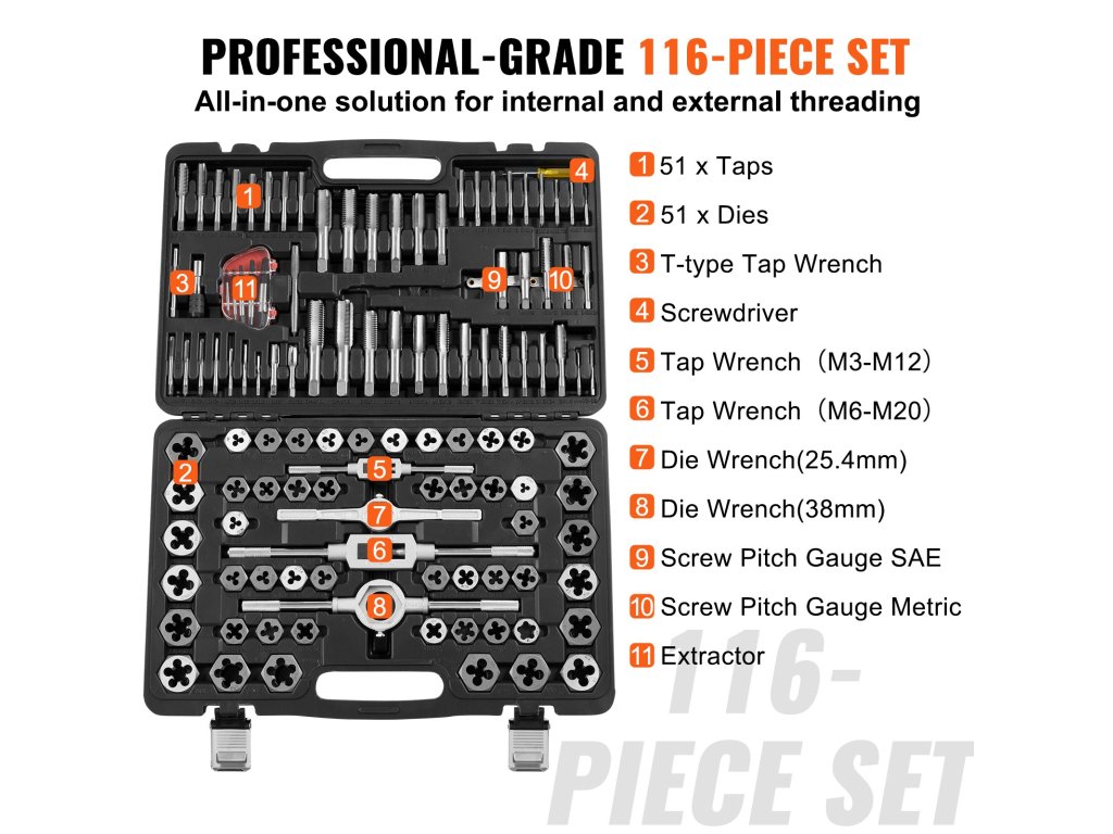 Professzionális 116 darabos menetvágó és szerszámkészlet, amely 51 különböző méretű menetvágót, 51 szerszámot, 1 T típusú menetvágó kulcsot, 1 csavarhúzót, 1 csavarhúzót, 1 menetkulcsot, 1 dugókulcsot, 1 dugókulcsot, 1 szerszámkulcsot, 1 szerszámkulcsot, 1 SAE csavarkulcs-osztásmérőt, 1 metrikus csavarkulcs-osztásmérőt és 5 kihúzót tartalmaz.