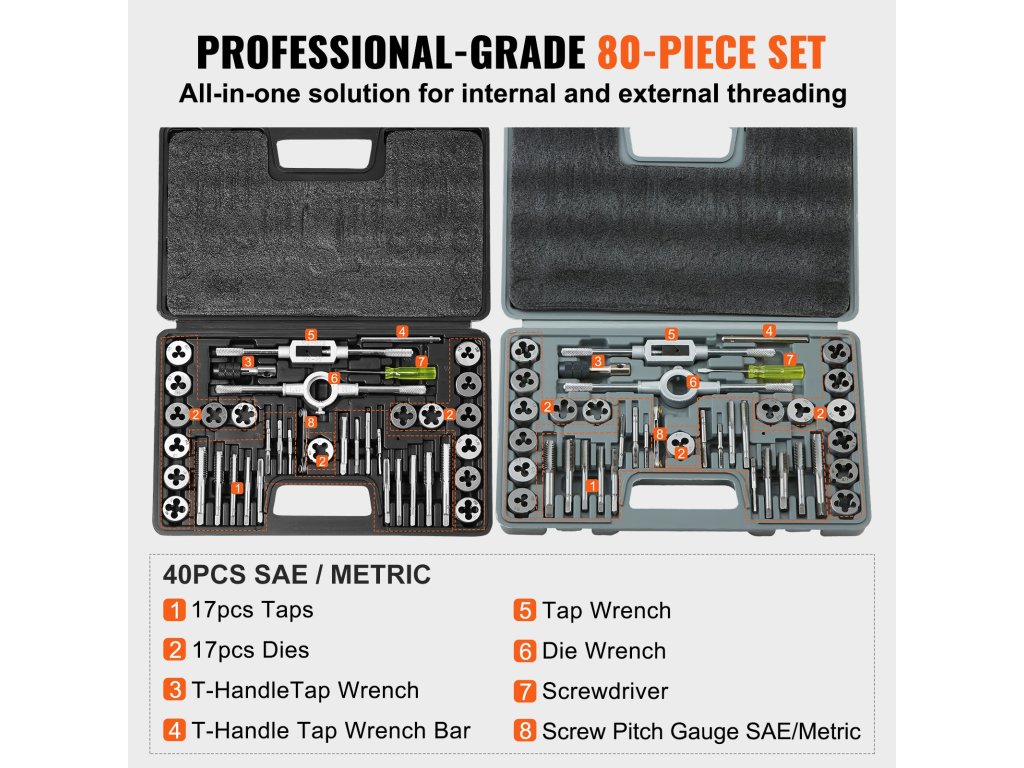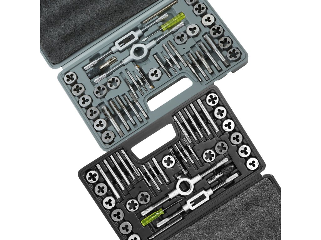 A 80 darabos professzionális menetvágó és szerszámkészlet, amely 34 különböző méretű szerszámot, 34 különböző méretű csapot, 2 x szerszámnyelet, 2 x csapolókulcsot, 2 x T-csavarkulcsot, 2 x csavarkulcsot és 2 x csavarhúzót tartalmaz, segít Önnek a menetvágási feladatok hatékony elvégzésében.