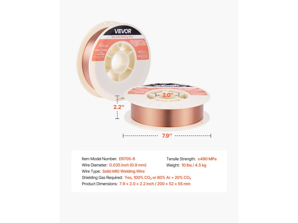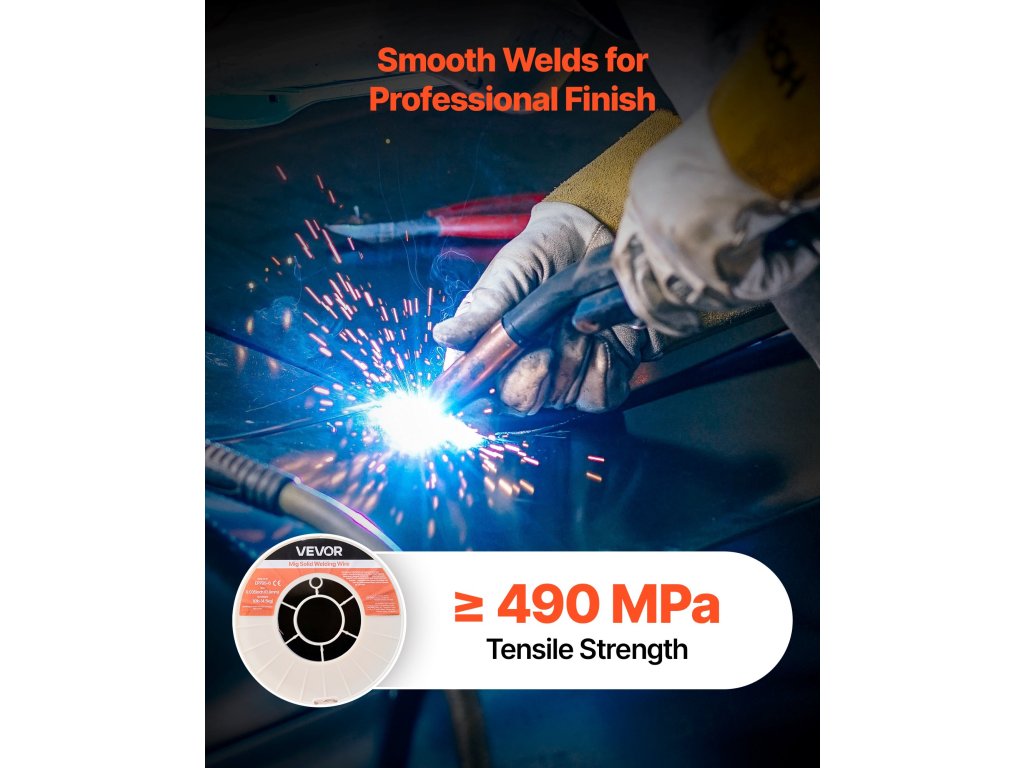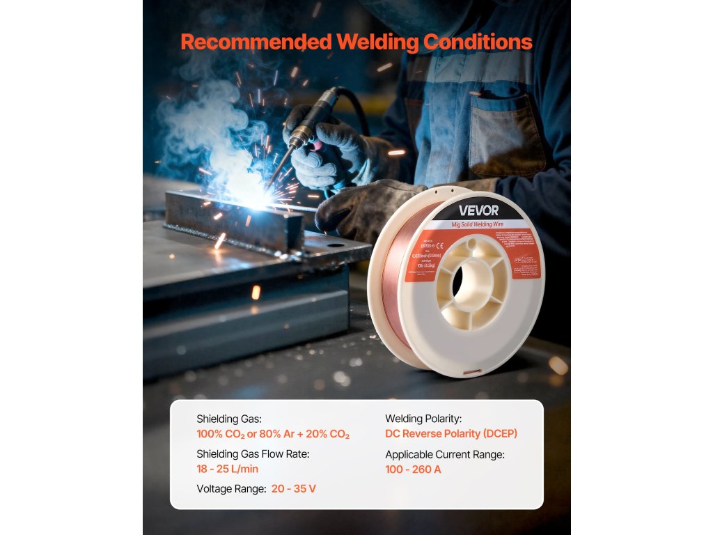 A VEVOR 0,035" 10 lb ER70S-6 tömör MIG hegesztőhuzal erős, egyenletes hegesztést biztosít sima huzaladagolással, alacsony fröccsenésszámmal és stabil ívvel. Támogatja a hegesztést minden pozícióban és nagy szakítószilárdsággal megbízható teljesítményt nyújt az autóipari, gépészeti és barkácshegesztési projektekben.
