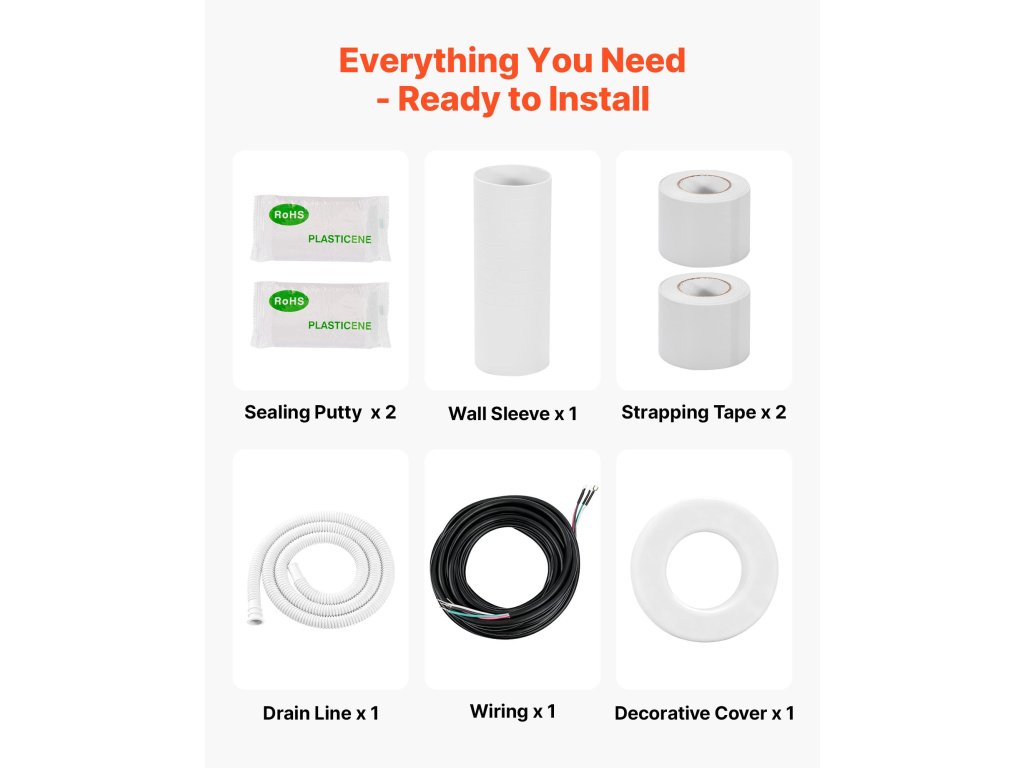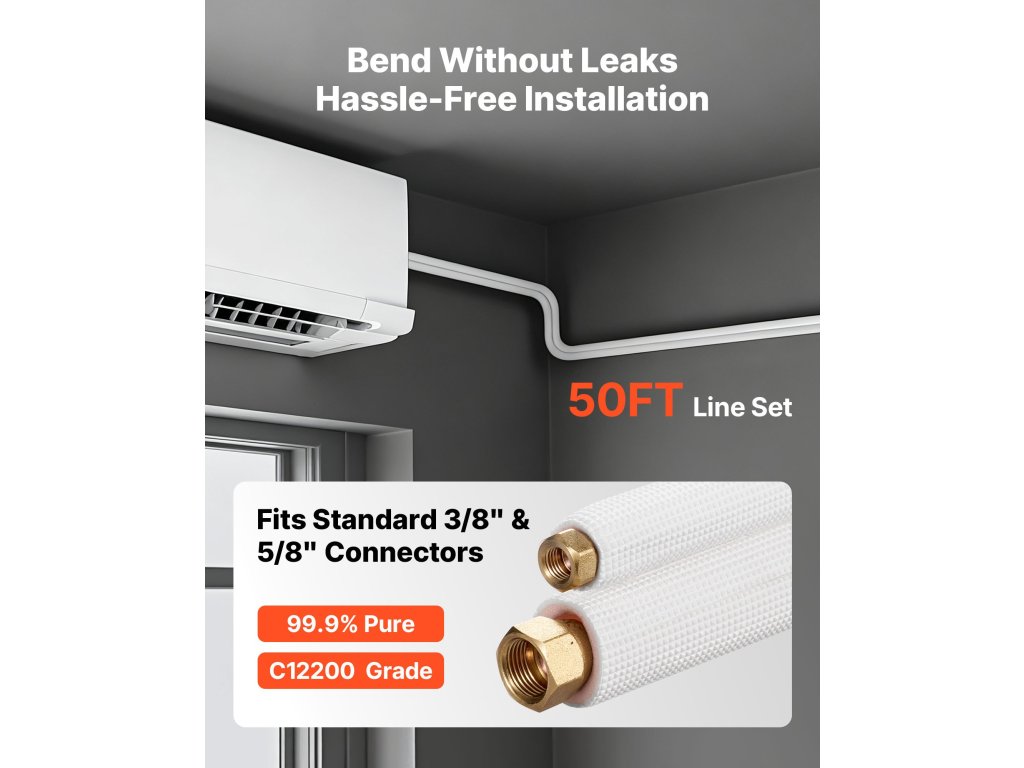 A készlet kompatibilis a mini-split légkondicionálókkal. A nagy tisztaságú csövek csomó- és szivárgásállóak, ideálisak a garázsban vagy műhelyben történő telepítéshez. Tartalmazza a pántolószalagot és az összes tartozékot az azonnali használathoz. Az egyszerű telepítés csak alapvető szerszámkészségeket igényel a beltéri és kültéri egységek csatlakoztatásához.