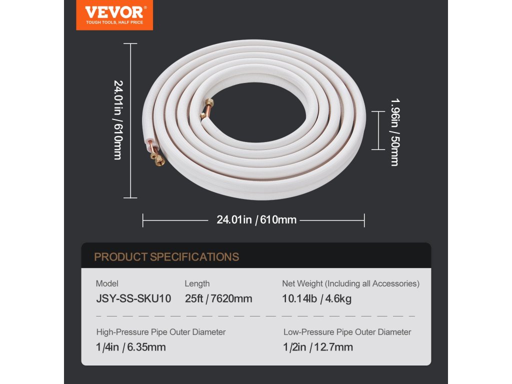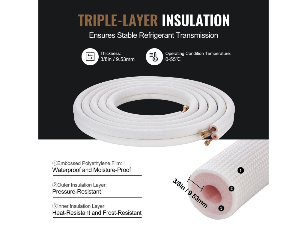 A belső rézcsövek jobb védelme érdekében a VEVOR a hagyományos kétrétegű szigetelőanyagokkal szemben háromrétegű szigetelőanyagokat használ a kiváló szigetelési tulajdonságok érdekében. A dombornyomott felületkezelés növeli a tartósságot és tagadhatatlan szilárdságot mutat.