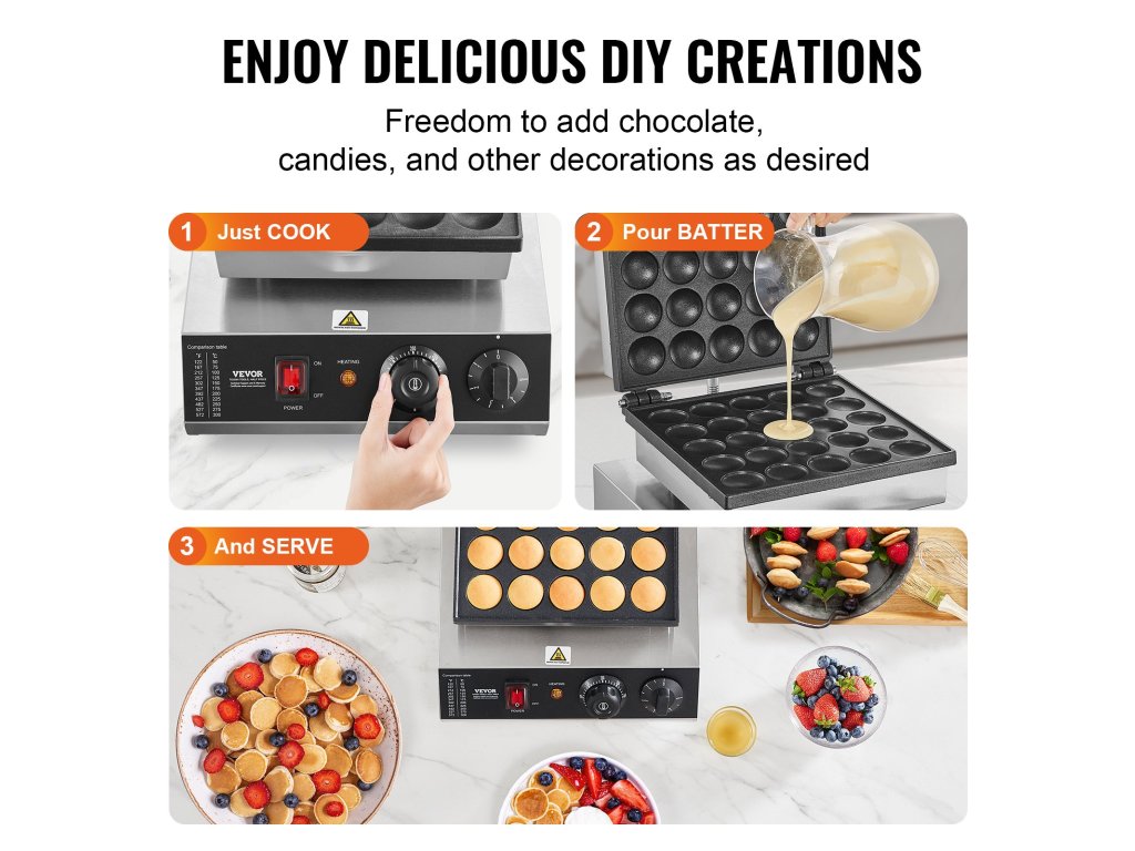 Pontos időzítővel és hőmérséklet-beállító gombbal van felszerelve, amelyek jól láthatóan fel vannak tüntetve. Amikor a gofri elkészül, egyértelmű hangjelzést ad. A dorayaki készítő zárt fűtési technológiát használ, amely biztosítja az egyenletes melegítést, a gyors formázást és az ízletes palacsinta könnyű elkészítését.