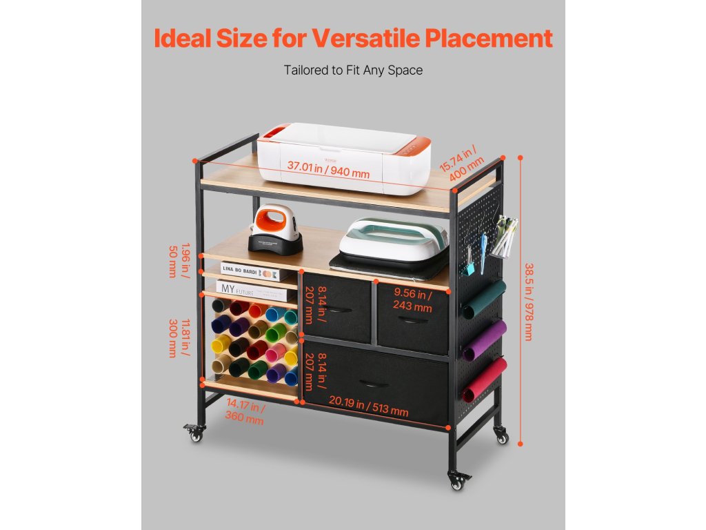 Ez a mobil kézműves kocsi és tárolóasztal kompatibilis az összes vágógéppel. Ezenkívül átalakítható hőlégnyomóállomássá, nyomtatóállvánnyá, varrókocsivá, ajándékcsomagoló asztallá vagy mindennapi tárolószekrénnyé, hogy megfeleljen a különböző kézműves és háztartási igényeinek.