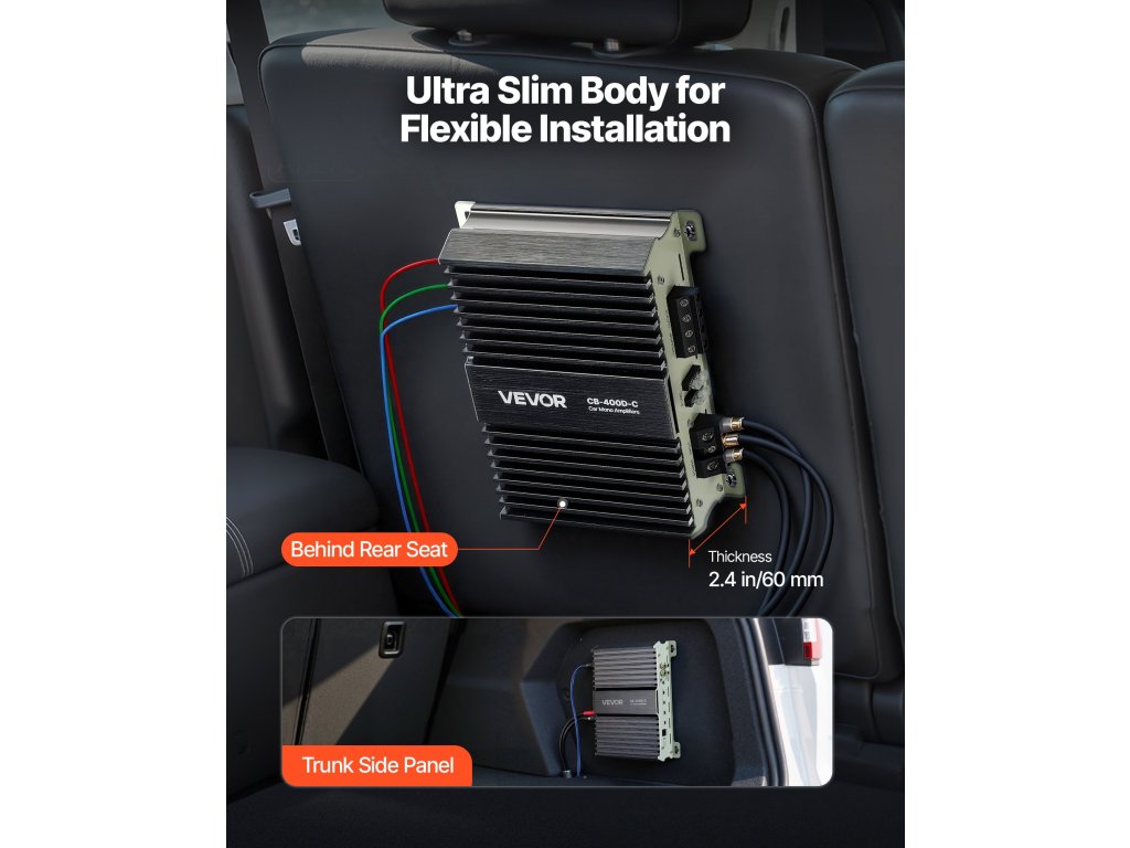 Egyetlen 10 hüvelykes, 12 hüvelykes vagy teljesítményben összehangolt kettős mélysugárzóhoz ajánlott. Száraz, jól szellőző helyre szerelje be a csomagtartóba vagy a vezetőfülkébe, elegendő helyet biztosítva a mono erősítő körül az autóban a hő elvezetéséhez.