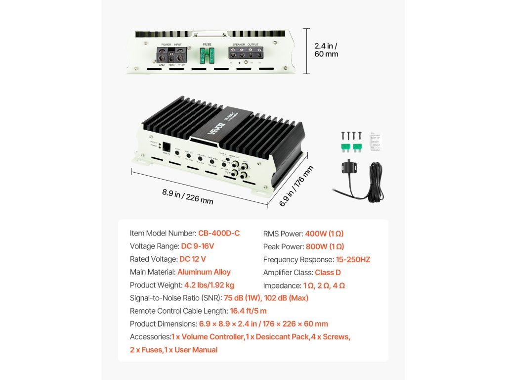 Monoblokk autórádió erősítő 400W rms, 1/2/4 Ω, 1 csatorna, lpf