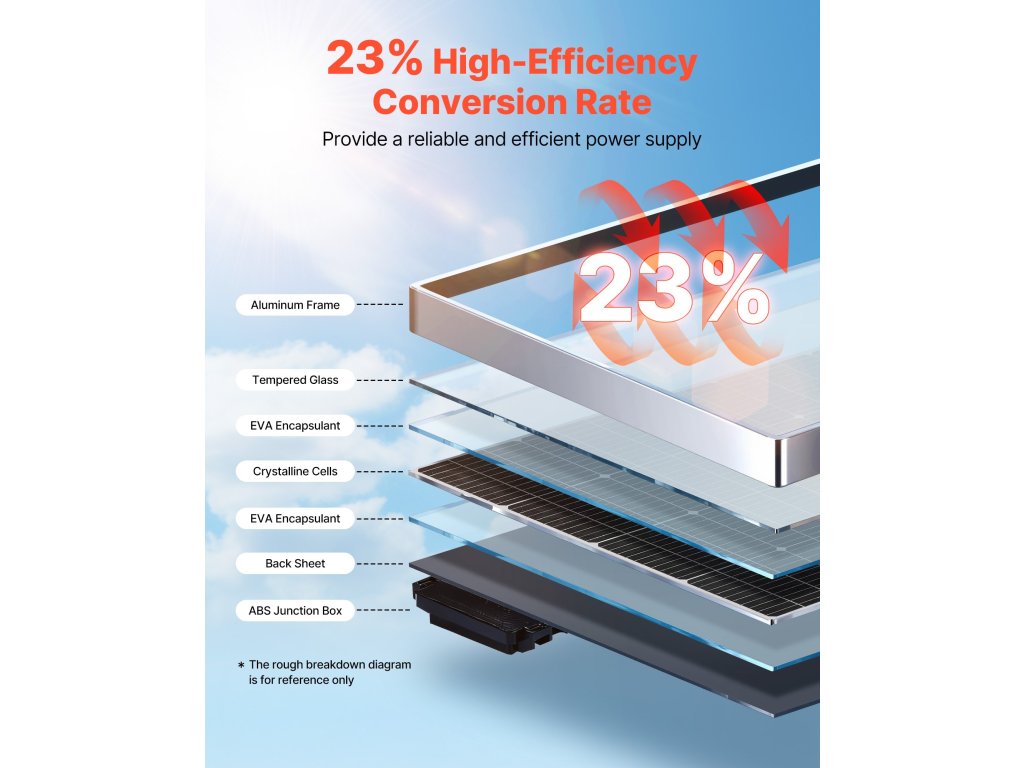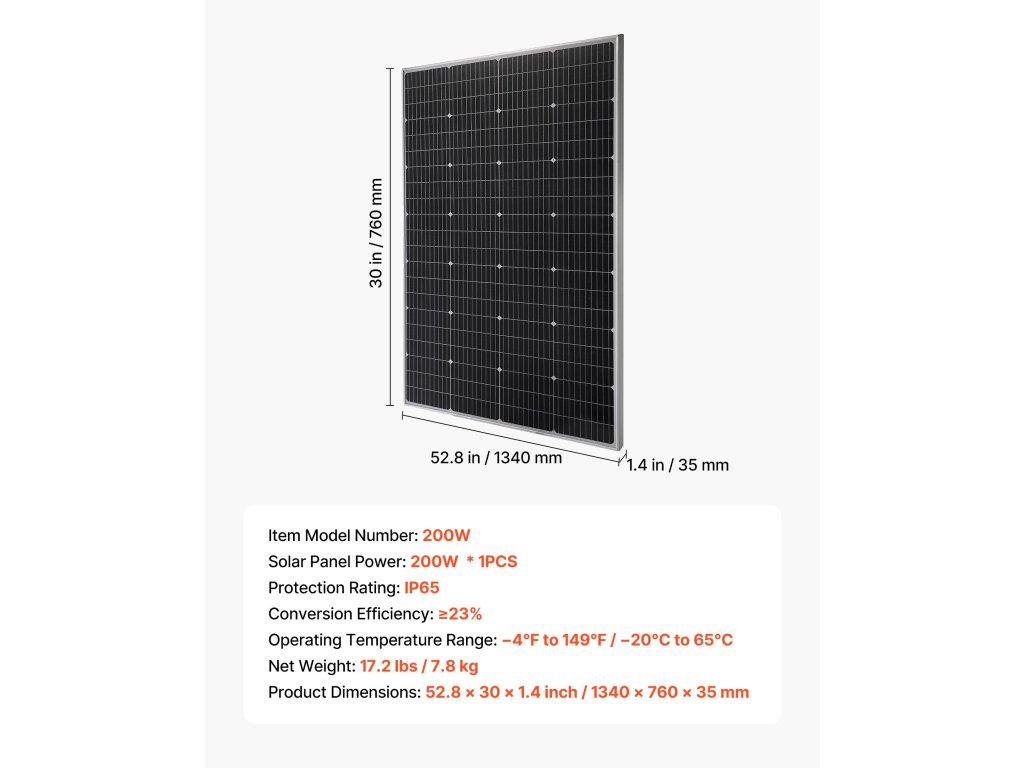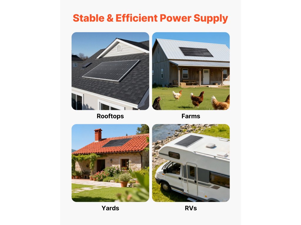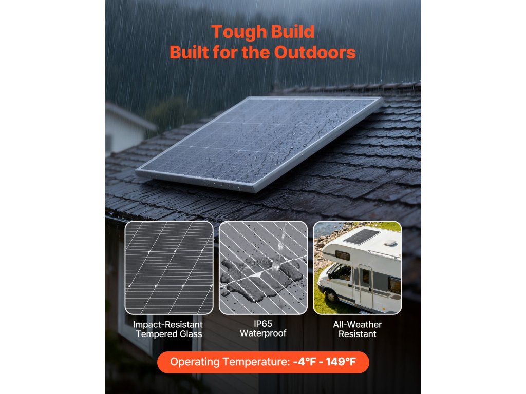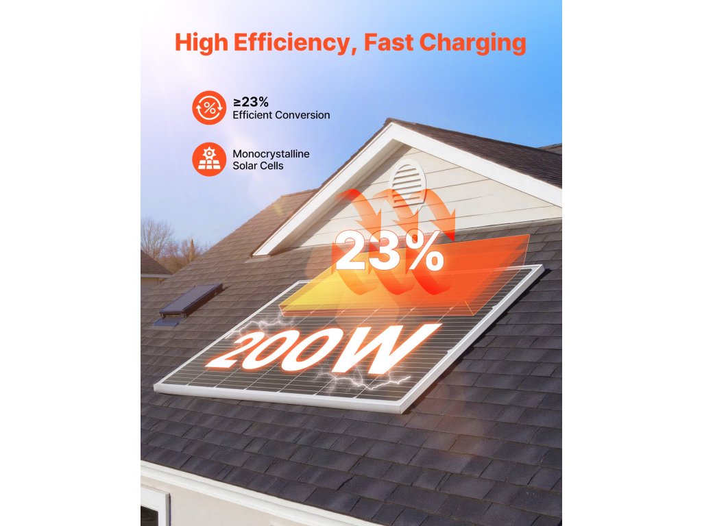 Ez a VEVOR 200 W-os monokristályos napelem ≥ 23%-os konverziós hatásfokot, stabil MC4 csatlakozást, IP65 védettséget és alumíniumkeretet biztosít a korrózió ellen. Megbízhatóan teljesít a legkülönbözőbb környezetekben, és stabil áramot biztosít autók, lakóautók, hajók, farmok, nyaralók és hálózaton kívüli rendszerek számára.