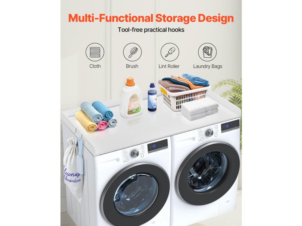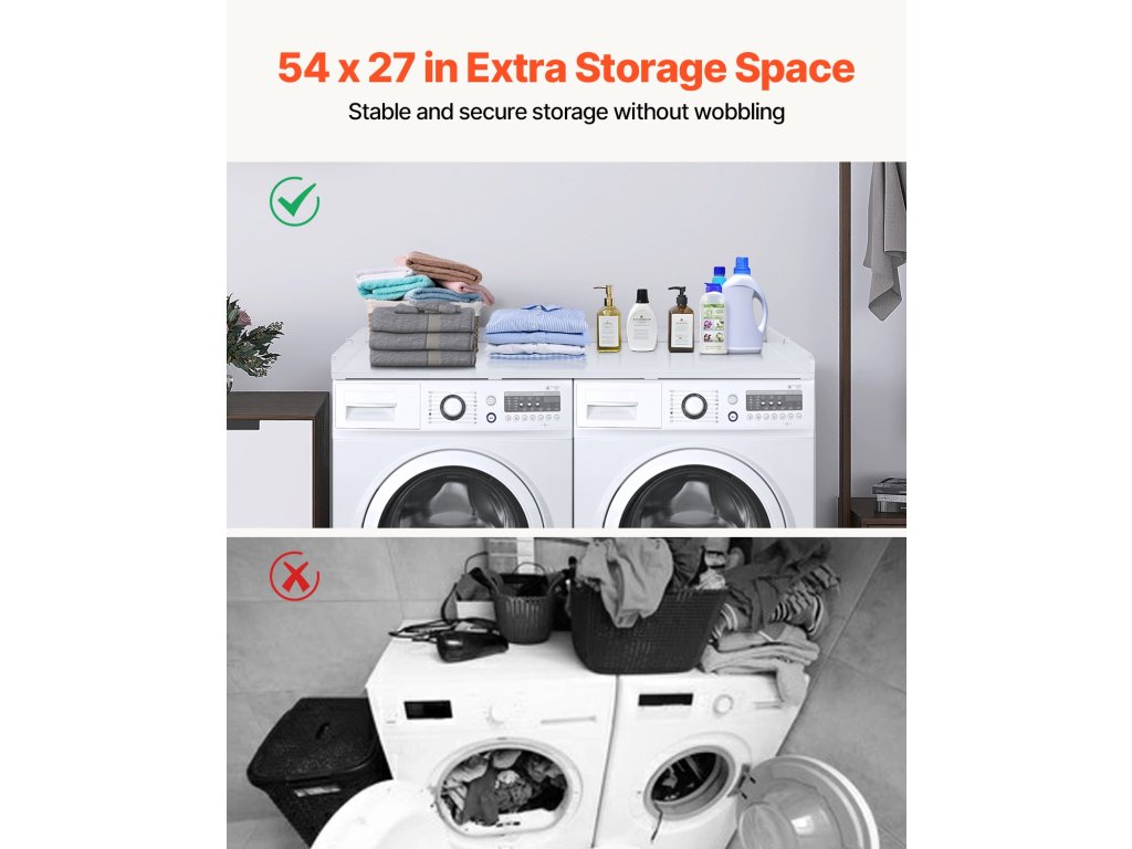 Ez a mosó- és szárítógép-pult 54 hüvelyk széles és 27 hüvelyk mély, így tágas munkaterületet biztosít a mosókonyha számára. Akár ruhákat hajtogat, akár tárgyakat válogat vagy szennyest tárol, ez a nagy felület minden igényt kielégít.