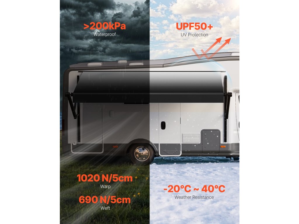 Tartós lakókocsi napellenzőt kínálunk, amely egy továbbfejlesztett 18oz 4 rétegű PVC vinil szövetet tartalmaz, amelyet úgy terveztek, hogy ellenálljon a változó időjárásnak. A megerősített alumíniumötvözetből készült keret vízálló, korrózióálló, és hosszú távú stabilitást és tartósságot biztosít.