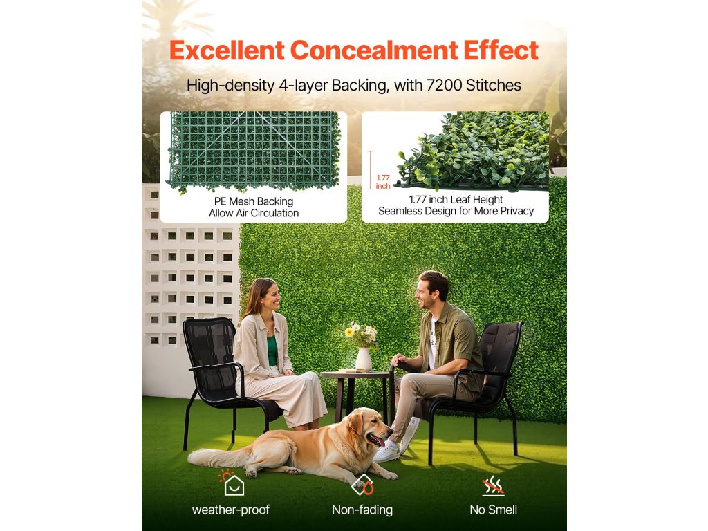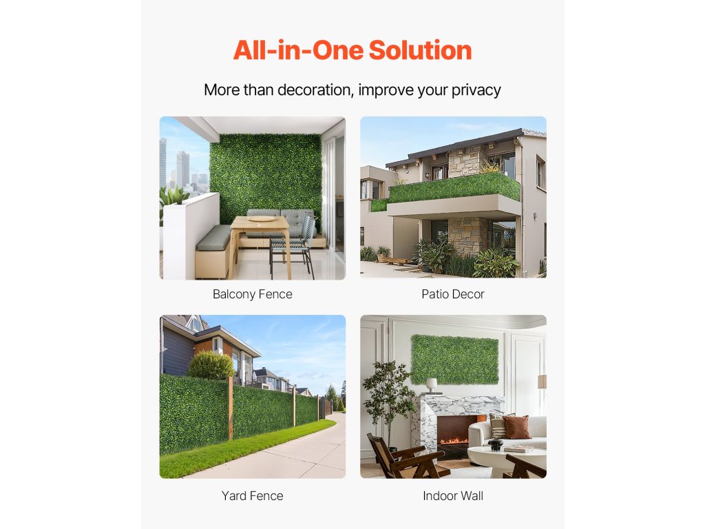 Ez a sűrű és természetesnek tűnő PE anyagból készült mesterséges növényfal egyszerű kötőelemekkel könnyen összeszerelhető. A biztonságos rögzítéshez cipzárakat is mellékelünk. A nagy sűrűségű, buja növényzettel ellátott alap nagyszerű védelmet nyújt a magánélethez.