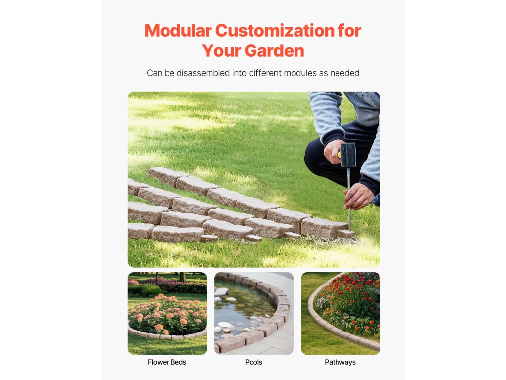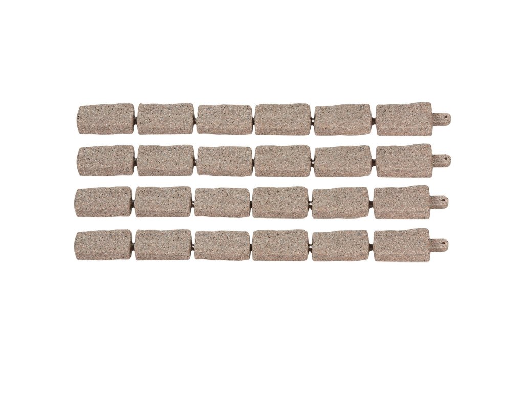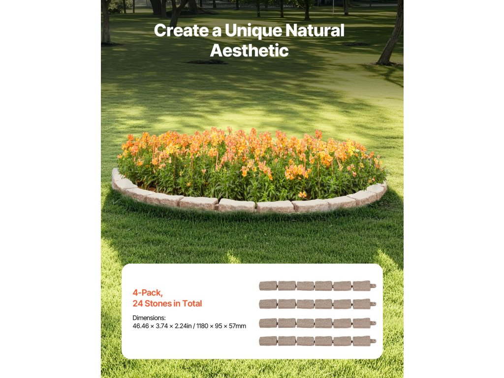 Ez a kőből készült kerti szegély valósághű kőszerkezettel rendelkezik, amely könnyedén növeli kertje, medencéje, sétányai vizuális vonzerejét. A moduláris kialakítás lehetővé teszi a gyors telepítést. Ez a gyepszegély kiváló minőségű PE-ből készült, fakulásálló, rozsdamentes, könnyű és hosszú élettartamú.