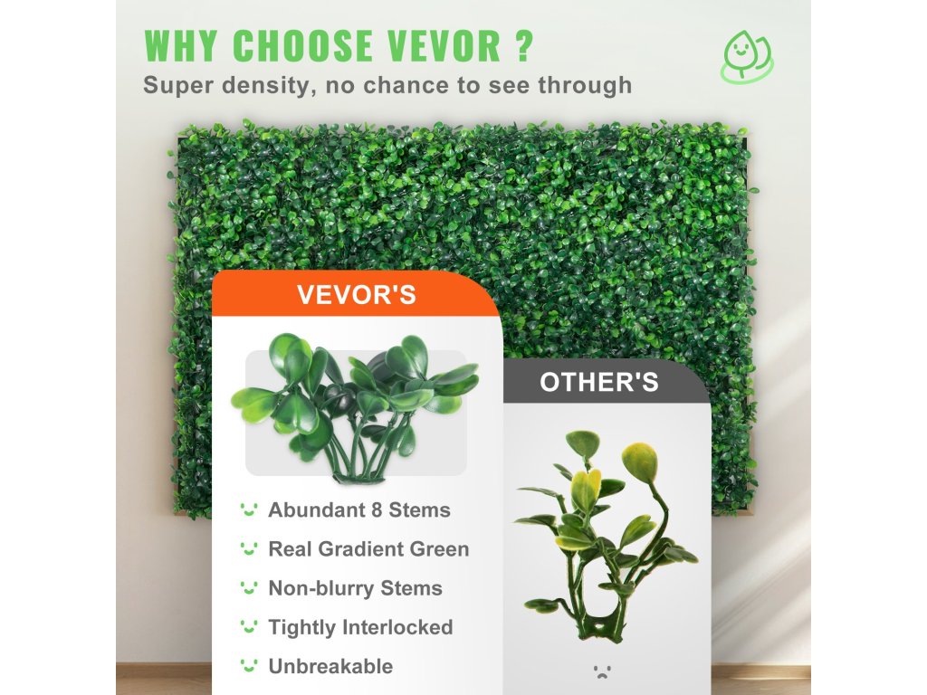 Készítsen barkácsdíszeket beltéren és kültéren a VEVOR mesterséges bokorfa panelekkel. Végtelenül valósághű fűfalakat kap, így minden alkalommal szánjon időt arra, hogy élvezze az egyedülálló bujaságot és szépséget. A PE-ből készült fűfalunk szagtalan, tartós és rendkívül valósághű esztétikával rendelkezik. Szóval mire vársz még? Most pedig készüljön fel, hogy élvezze a zöld örömét!