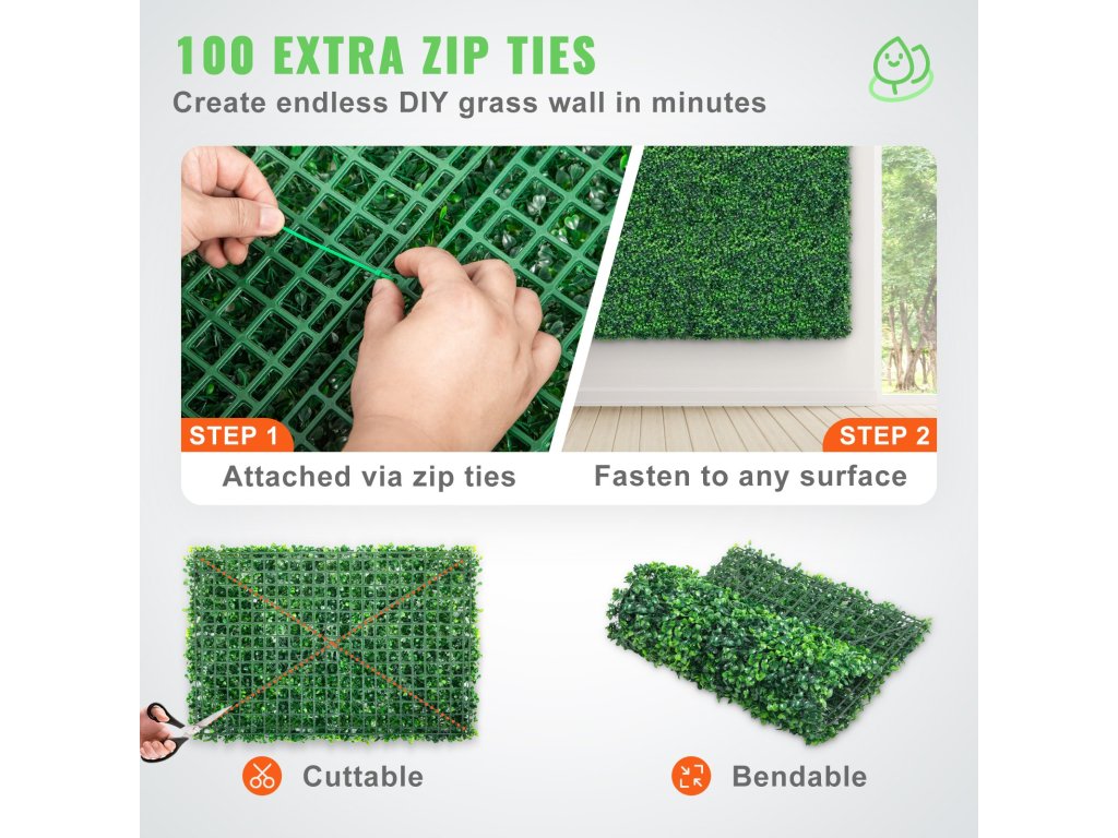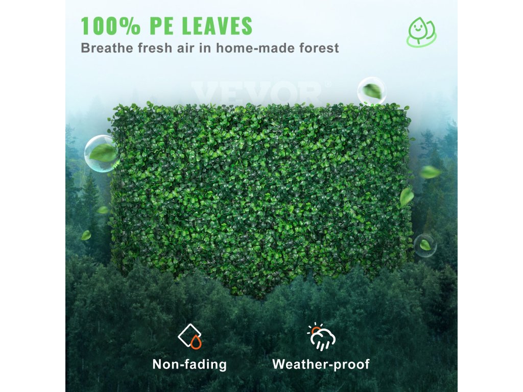 Készítsen barkácsdíszeket beltéren és kültéren a VEVOR mesterséges bokorfa panelekkel. Végtelenül valósághű fűfalakat kap, így minden alkalommal szánjon időt arra, hogy élvezze az egyedülálló bujaságot és szépséget. A PE-ből készült fűfalunk szagtalan, tartós és rendkívül valósághű esztétikával rendelkezik. Szóval mire vársz még? Most pedig készüljön fel, hogy élvezze a zöld örömét!
