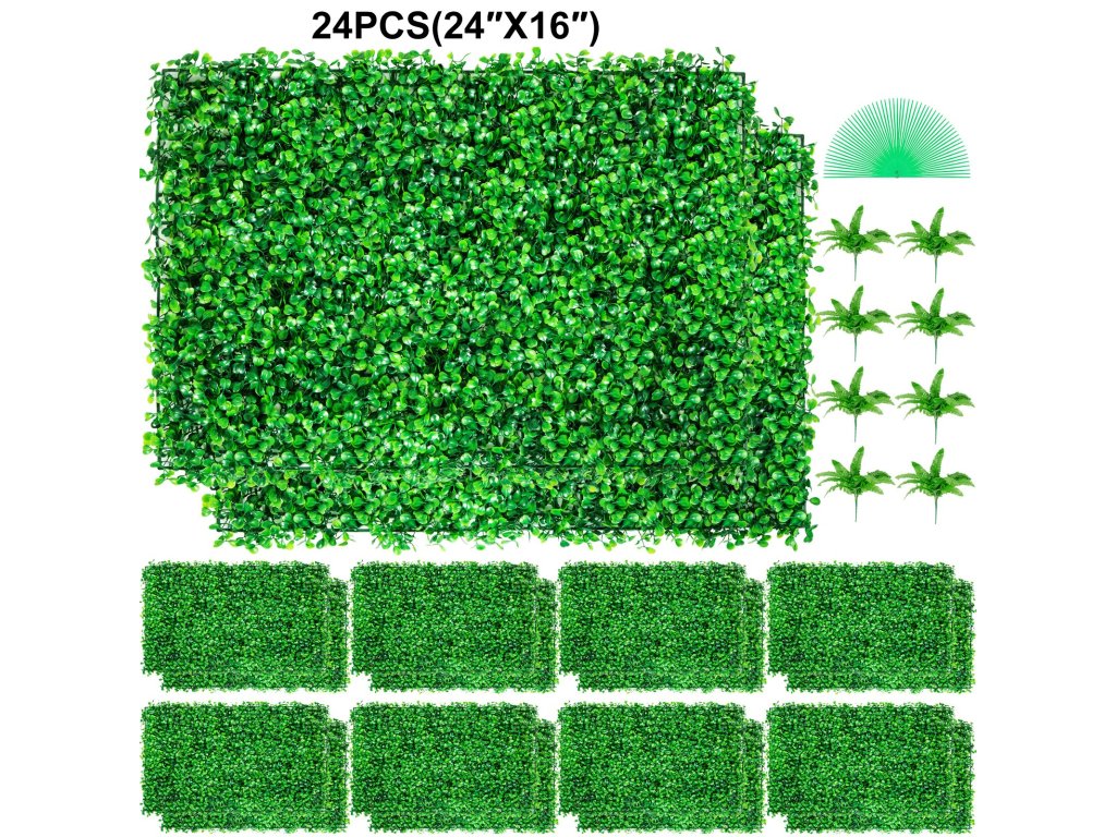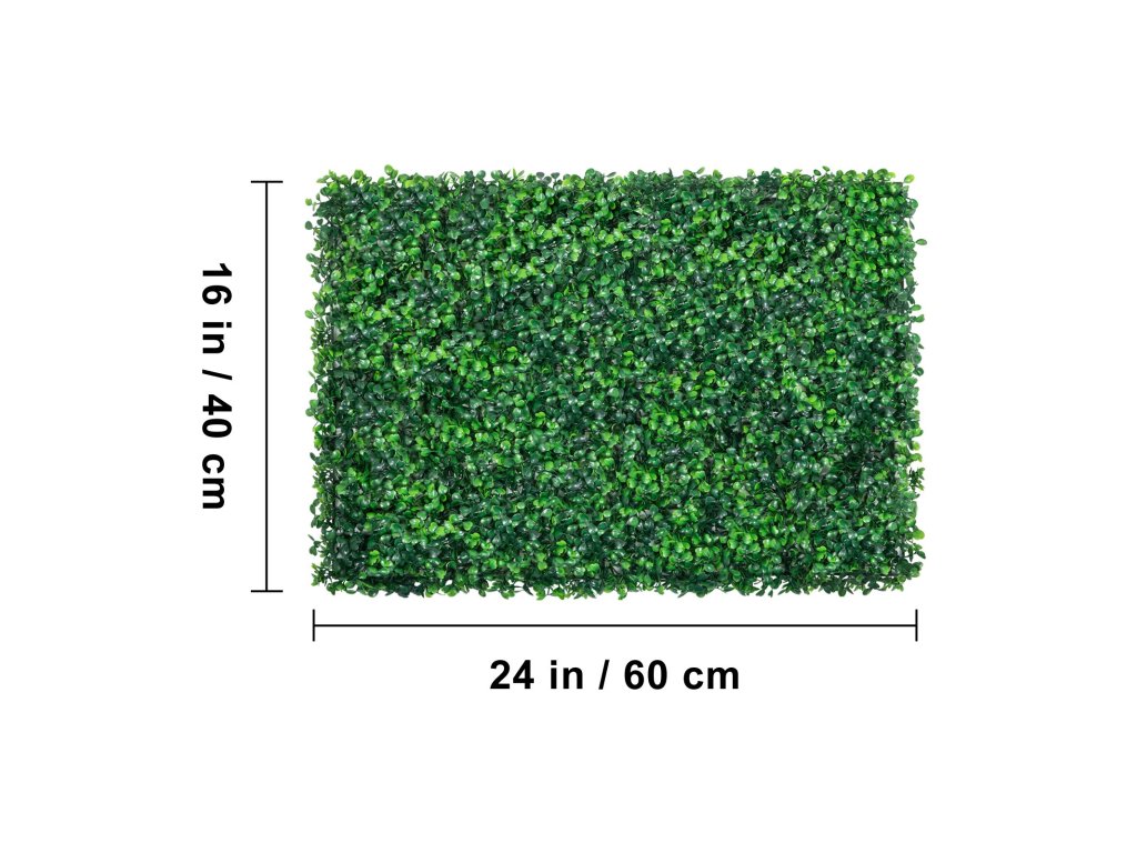 Méret: 24'' x 16''. Mesterséges sövénynövényünk 100%-ban környezetbarát polietilénből készült, amely hosszú élettartamot biztosít fakulás nélkül.