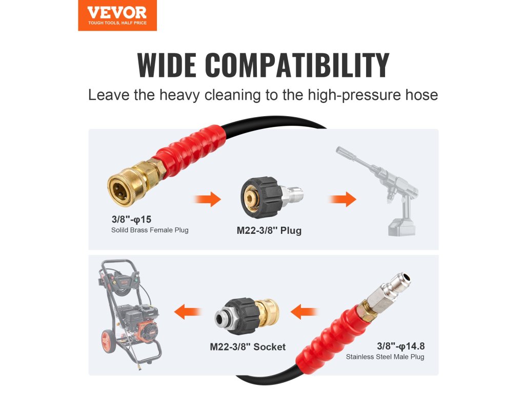 A 3/8"-φ14,8 hímivarú, 3/8"-φ15 nőivarú csatlakozó biztonságos és szivárgásmentes csatlakozást biztosít a magasnyomású mosóhoz, a legtöbb szabványos magasnyomású mosó modellhez tervezve.