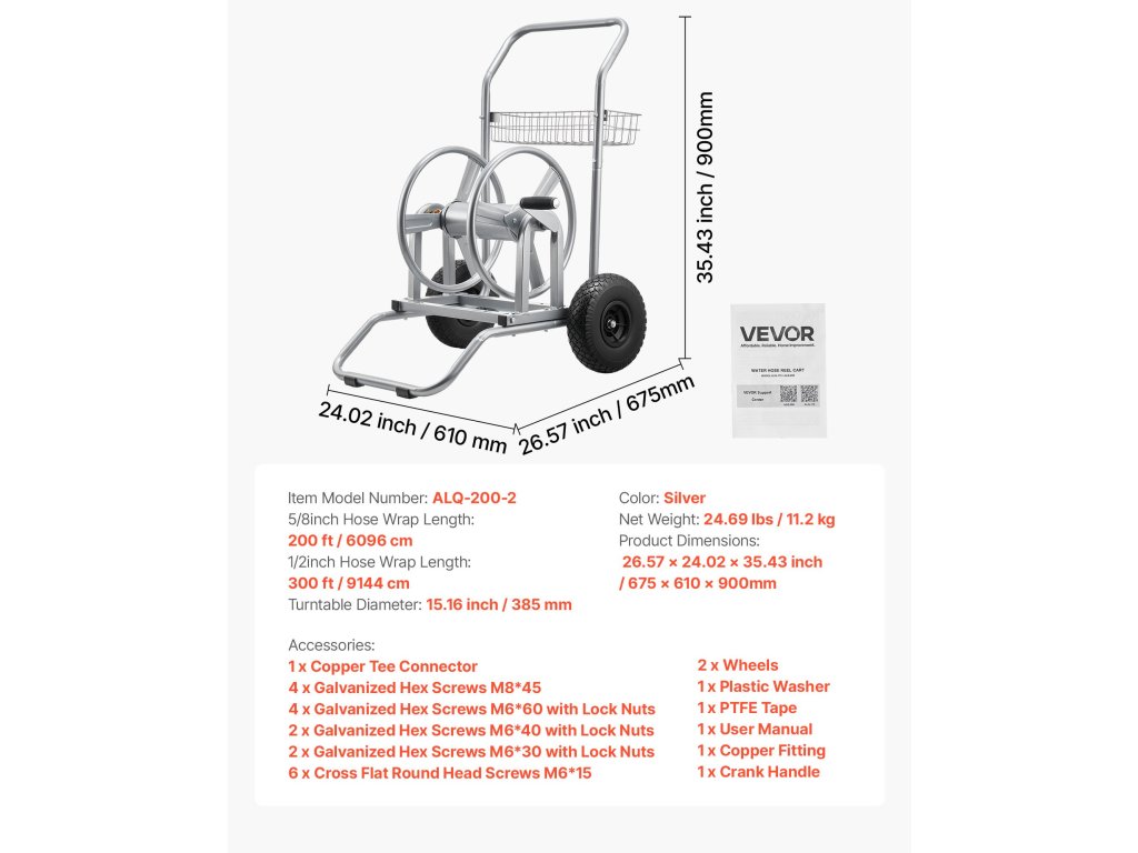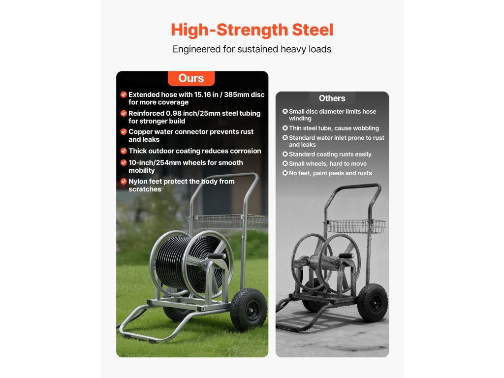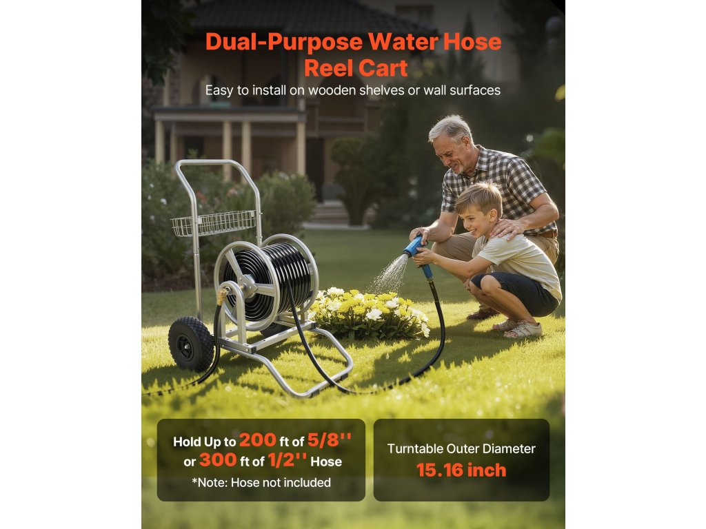 Ez a Q235A acélból készült, sárgaréz szerelvényekkel ellátott víztömlő-tekercselő kocsi 300 láb (9144 cm) 1/2" (12,7 mm) tömlő vagy 200 láb (6096 cm) 5/8" (15,88 mm) tömlő befogadására alkalmas. A fogaskerekes orsó megkönnyíti a feltekerést, míg az alacsony középpont és a csúszásmentes kerekek stabilan tartják fűben, kavicsos vagy egyenetlen talajon.