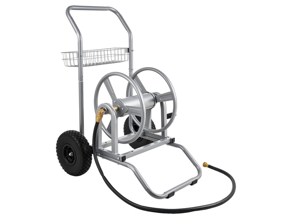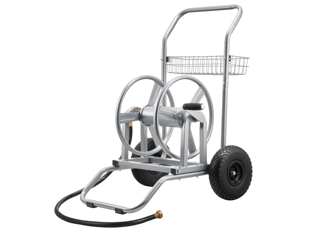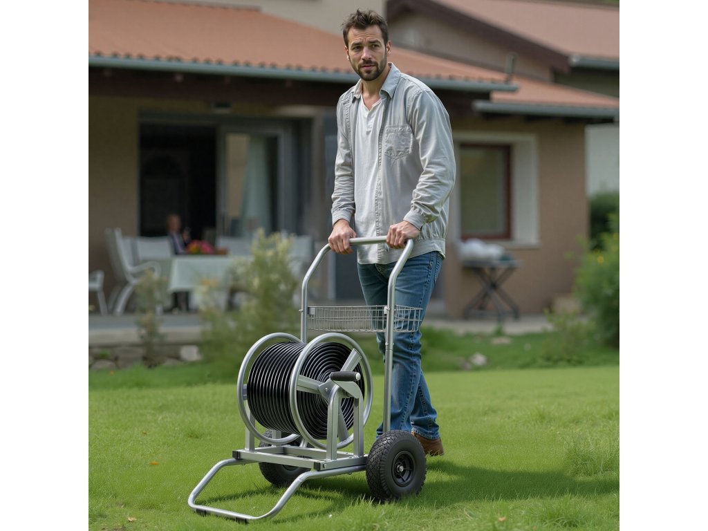 Nagynyomású tömlőkocsi, 2 kerékkel, fogantyúval, hálós kosárral