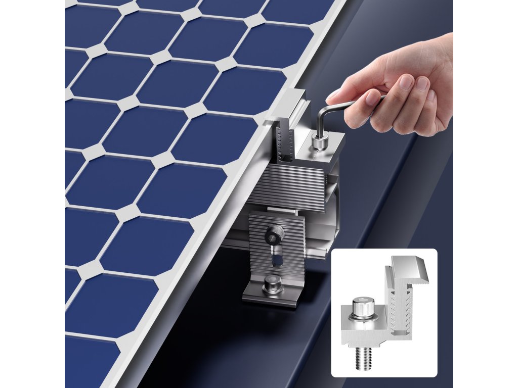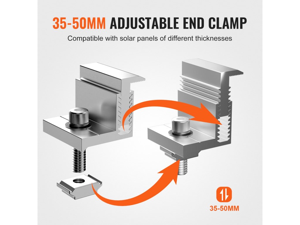 Az állítható végkapocs kialakításnak köszönhetően a napelemek Z rögzítő konzolja könnyedén beállítható a különböző vastagságú napelemekhez. Kompatibilisek az 1,38 és 1,97 hüvelyk (35 és 50 mm) közötti méretű keretes napelemekkel.
