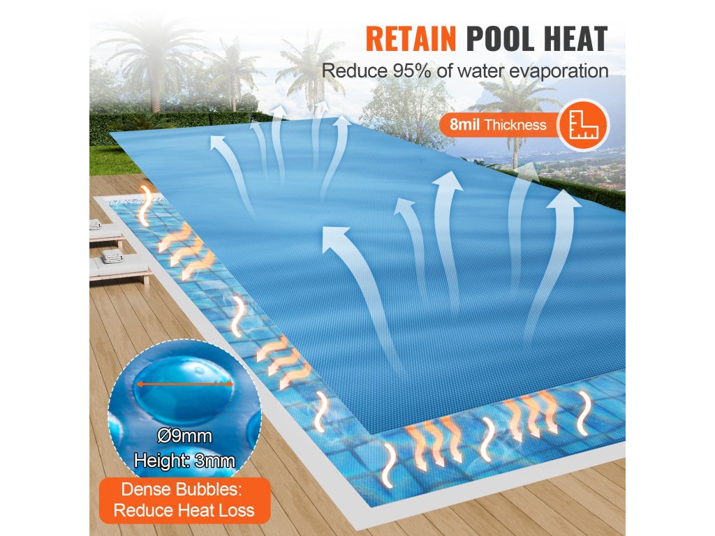 A professzionális PE-anyagból készült, Ø9 mm-es buborékátmérőjű szolármedence-takarónk hatékonyan megakadályozza a víz akár 95%-os elpárolgását. Ez jelentősen csökkenti a medence fűtési költségeit!