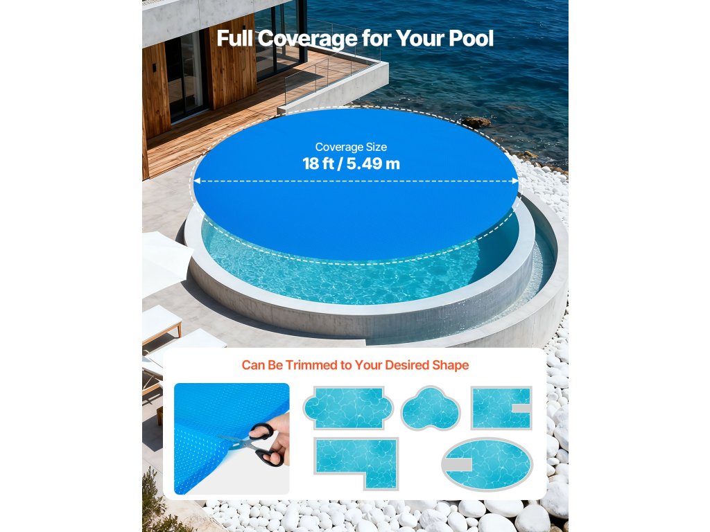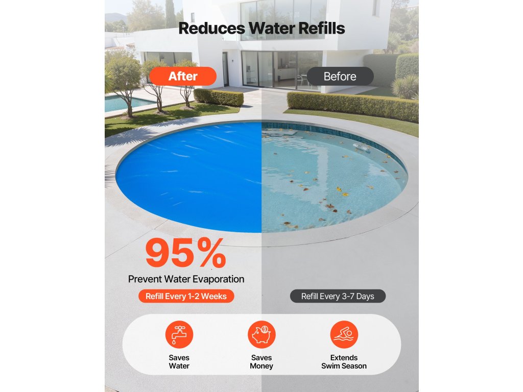 Hosszabbítsa meg az úszási szezont a 18 láb/5,49 méteres napelemes medencefedéllel. Segít megemelni a víz hőmérsékletét és megtartani a hőt egy éjszaka alatt. Tartós, 16 miliméteres PE anyagból készült, 95%-kal csökkenti a párolgást, minimálisra csökkenti a víz utántöltésének szükségességét, és tisztán tartja medencéjét.