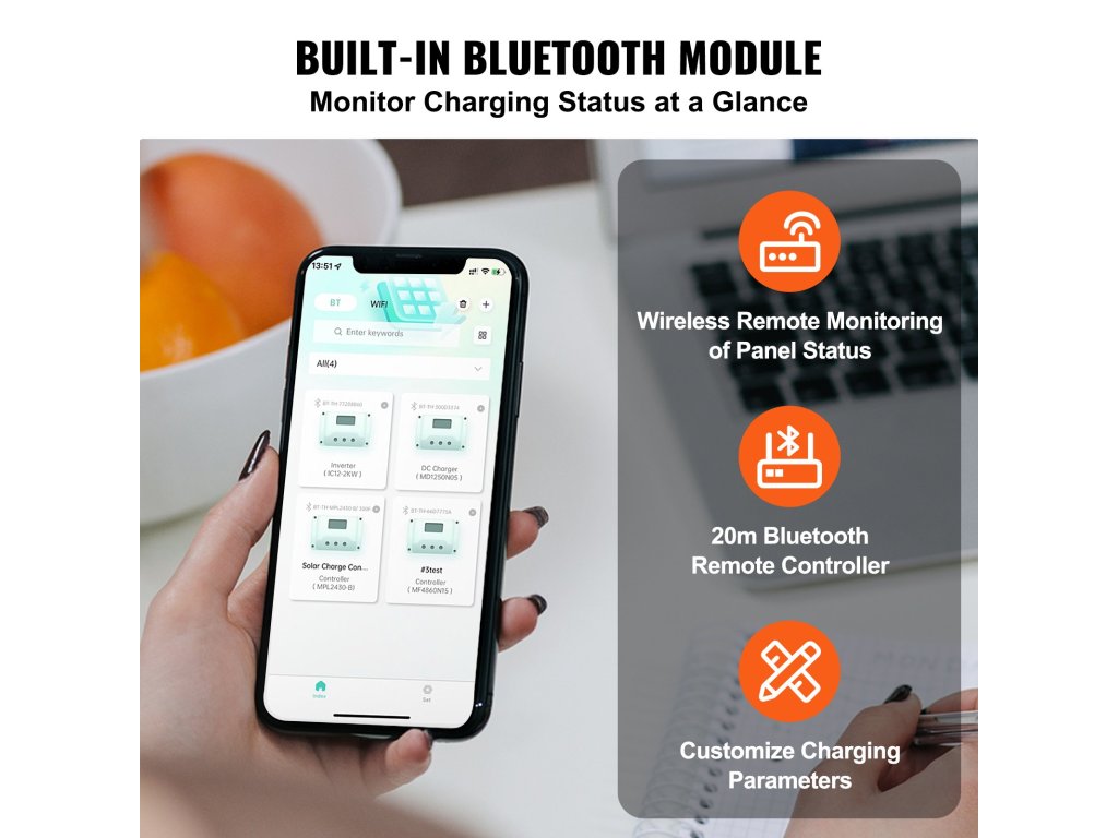 Beépített Bluetooth-modullal rendelkezik, amely lehetővé teszi a felhasználók számára, hogy távolról, 20 méteres távolságon belül megtekinthessék az alapvető adatokat, így a felhasználók számára kényelmesebbé válik az mppt napelemes vezérlő működési állapotának figyelemmel kísérése és beállítása.