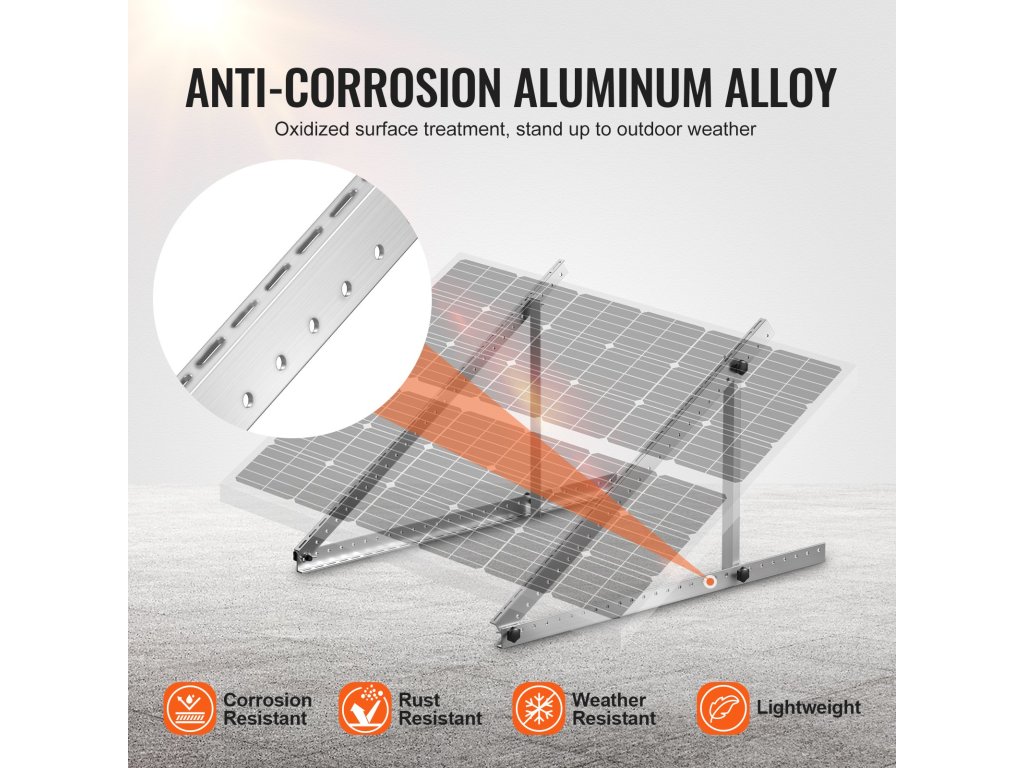 Válassza a VEVOR 2 napelemtartó konzolkészletet a megbízható támogatás érdekében.A rugalmas 0-90°-os beállítás maximalizálja a napfénynek való kitettséget és az energiahatékonyságot. a 265 lb terhelhetőség és az eloxált alumíniumötvözetből készült szerkezet tartós stabilitást biztosít, így ideális választás a napelem-szerelvényhez.
