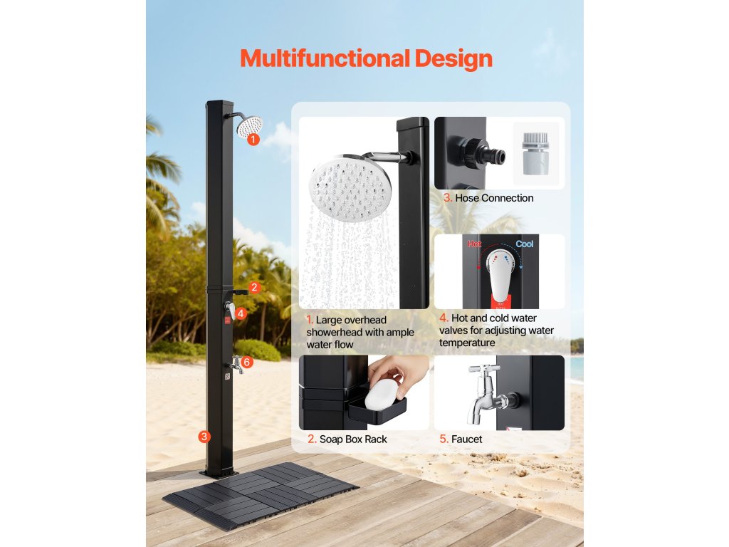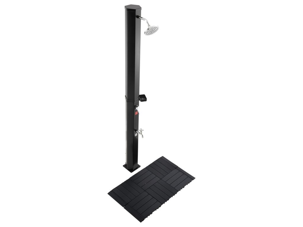 A napenergiával fűtött víz egyenletes áramlást biztosít a fürdés előtti vagy utáni öblítéshez. Ideális meleg időben történő használatra - hideg évszakokban nem alkalmas.