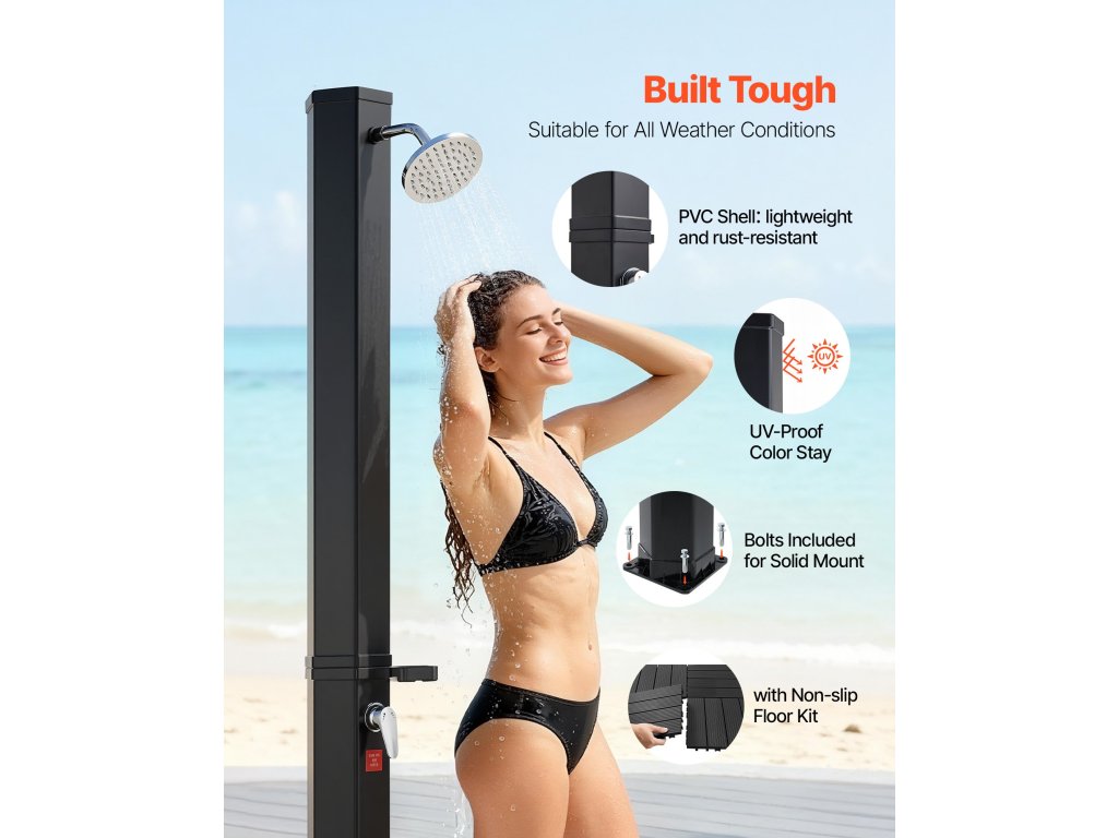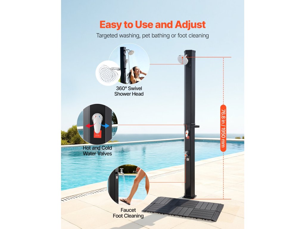 Nagyszerű hátsó udvari medencékhez, kempingezéshez vagy strandoláshoz. Gyorsan leöblítheti a homokot, a sót vagy a naptejet, mielőtt a házba indulna. Kényelmes módot kínál a szabadtéri tevékenységek utáni felfrissülésre.