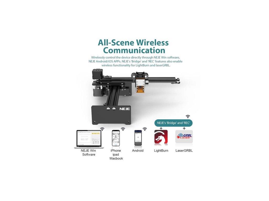 Támogatja a NEJE+ Lightburn vezeték nélküli vezérlést, hogy egyetlen laptop segítségével több eszközt is kezelhessen.