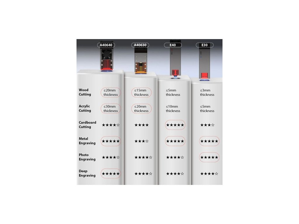 Az A40630 modullal kombinálva a NEJE 5 egy kompakt és hordozható asztali lézergravírozó és vágógép, amely kiváló gravírozási és vágási képességekkel rendelkezik. Az új NEJE 5 zökkenőmentes reset technológiával és frissített vezérlőrendszerrel rendelkezik, amely jelentős újításokat hozott az olyan szoftverekkel, mint a Lightburn, a NEJE szoftver, a LaserGRBL és az olyan eszközökkel, mint a forgótengelyek, való integráció terén. Az A40630 modul egy önálló egység lencsevédelemmel és állítható fókusztávolsággal, amely a Nichia FAC optikai tömörítési technológiával felszerelt, iparágvezető moduljait használja. Intelligens ventilátorsebesség-szabályozással rendelkezik a csendesebb működés érdekében, a könnyebb kezelhetőség érdekében gyenge fényviszonyok között pozicionáló funkcióval, valamint karbantartásmentes, nagynyomású, tűcsővel ellátott gáztámogató funkcióval.
