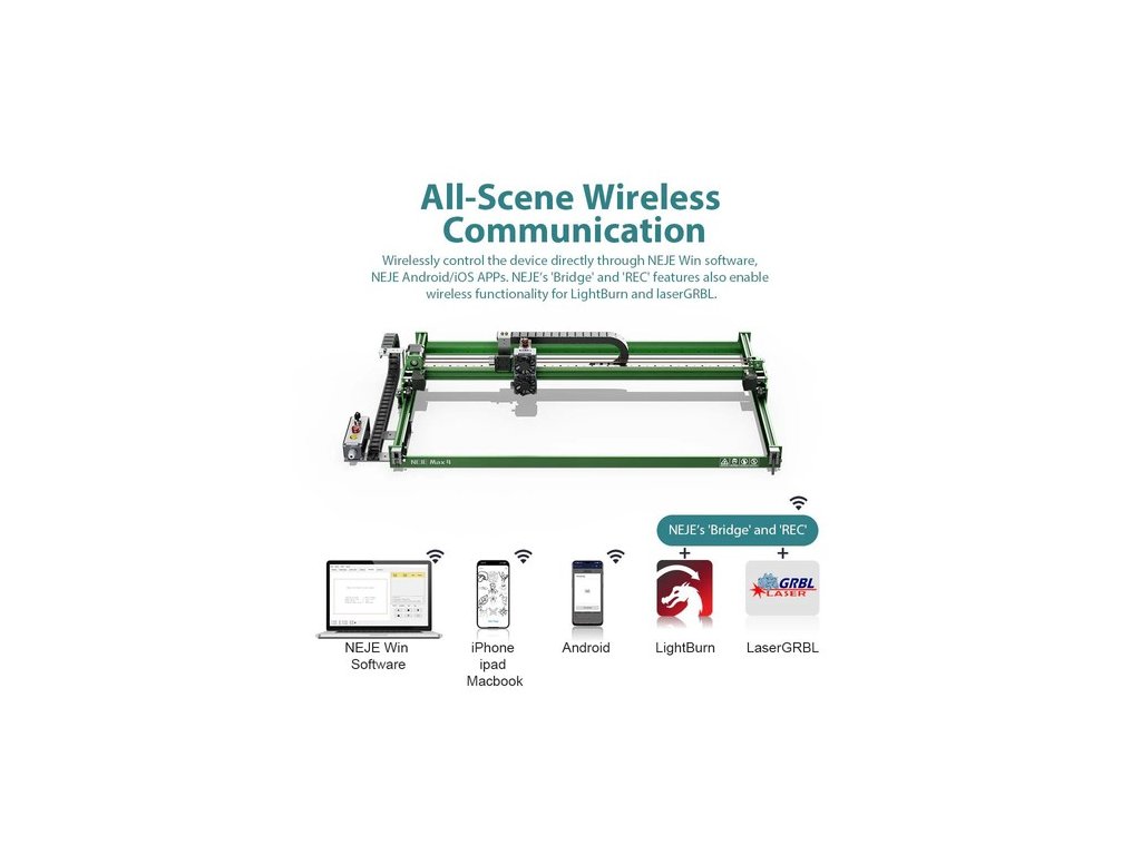 | Szoftver és szolgáltatás | LaserGRBL, LightBurn, NEJE Win szoftver (professzionális többrétegű vezérlőszoftver, amely magában foglalja a NEJE "REC" funkciót és a NEJE "Bridge" funkciót)NEJE app (Android app, eszköz a vezeték nélküli átvitelhez Android telefonról számítógépre; APP iPhone és Mac számára)NEJE Cloud (tartalomszolgáltatási platform)NEJE OTA (szoftver- és firmware-frissítési szolgáltatás az interneten keresztül) |
