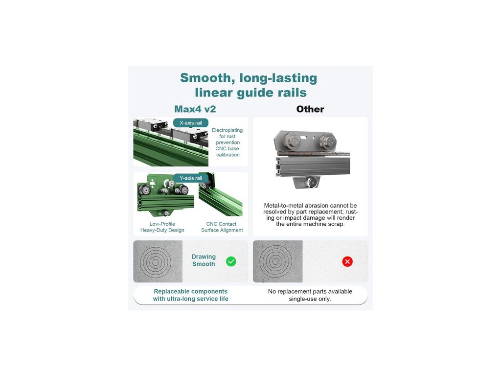 A továbbfejlesztett NEJE MAX 4 lézergravírozó gép ipari minőségű, nagy keménységű ötvözetből készült sínekkel van felszerelve, amelyek hatékonyan kiküszöbölik a gép rezgését és 0,01 mm mechanikai pontossággal javítják a gép stabilitását. A NEJE E80 nagy felbontású modul segítségével mindössze 10 percbe telik egy 300 x 300 mm-es műtárgy megrajzolása, és a finom műtárgyak finoman és meglepően jól kivitelezettek.